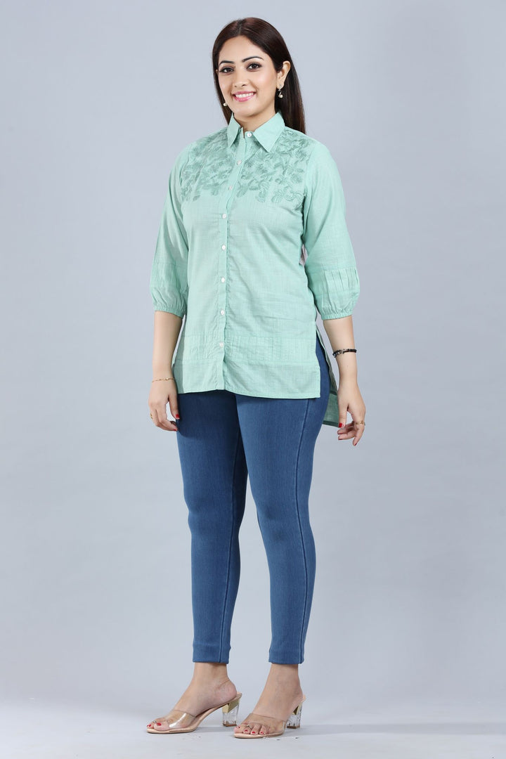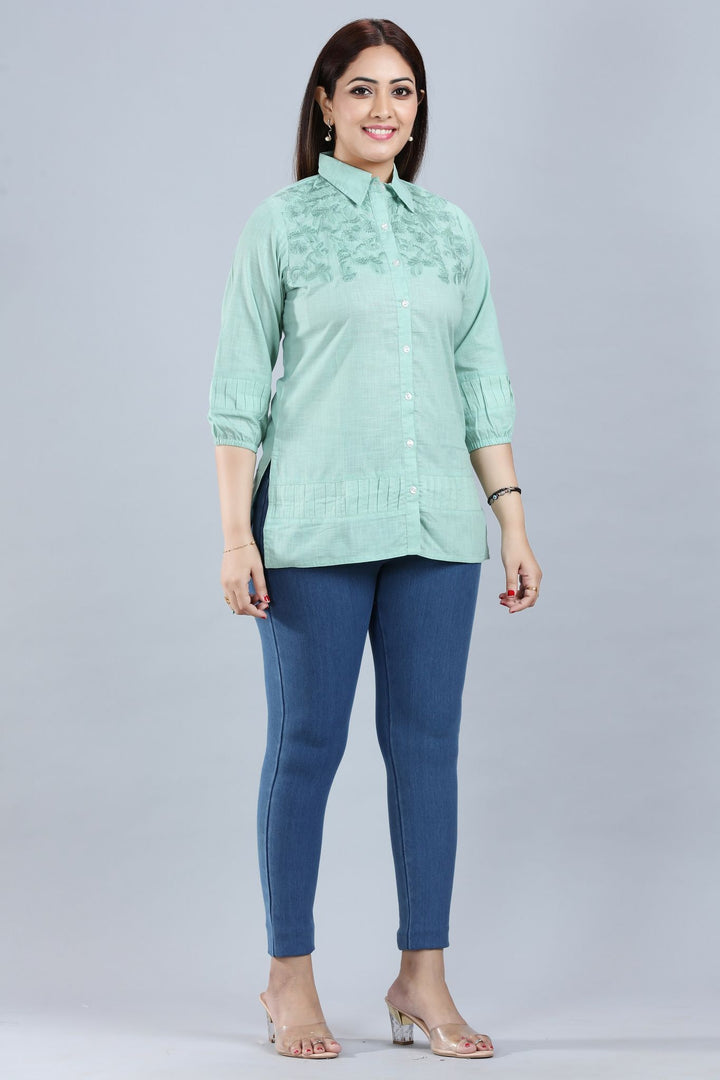 Light Pista Cotton Embroidred Short Kurta