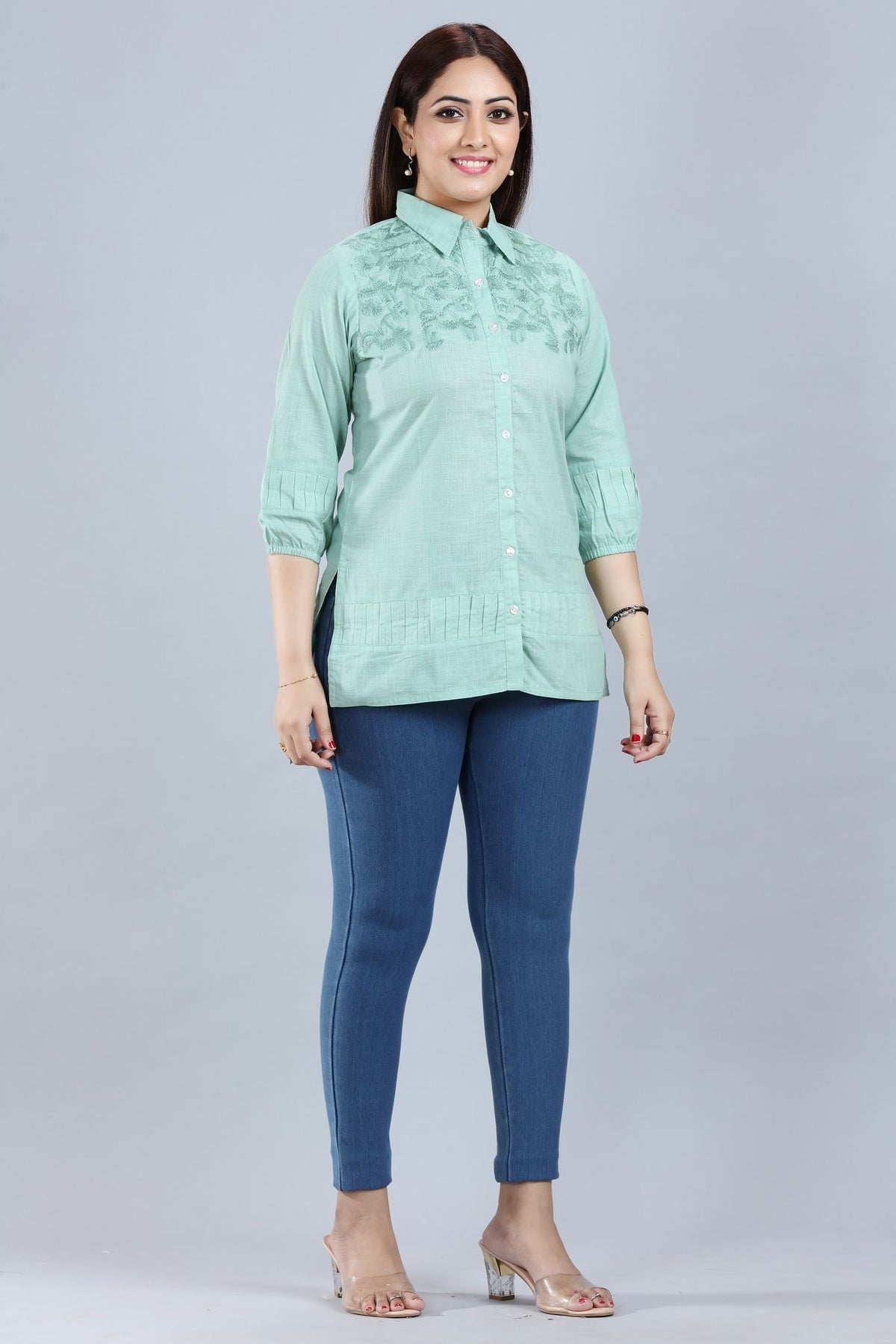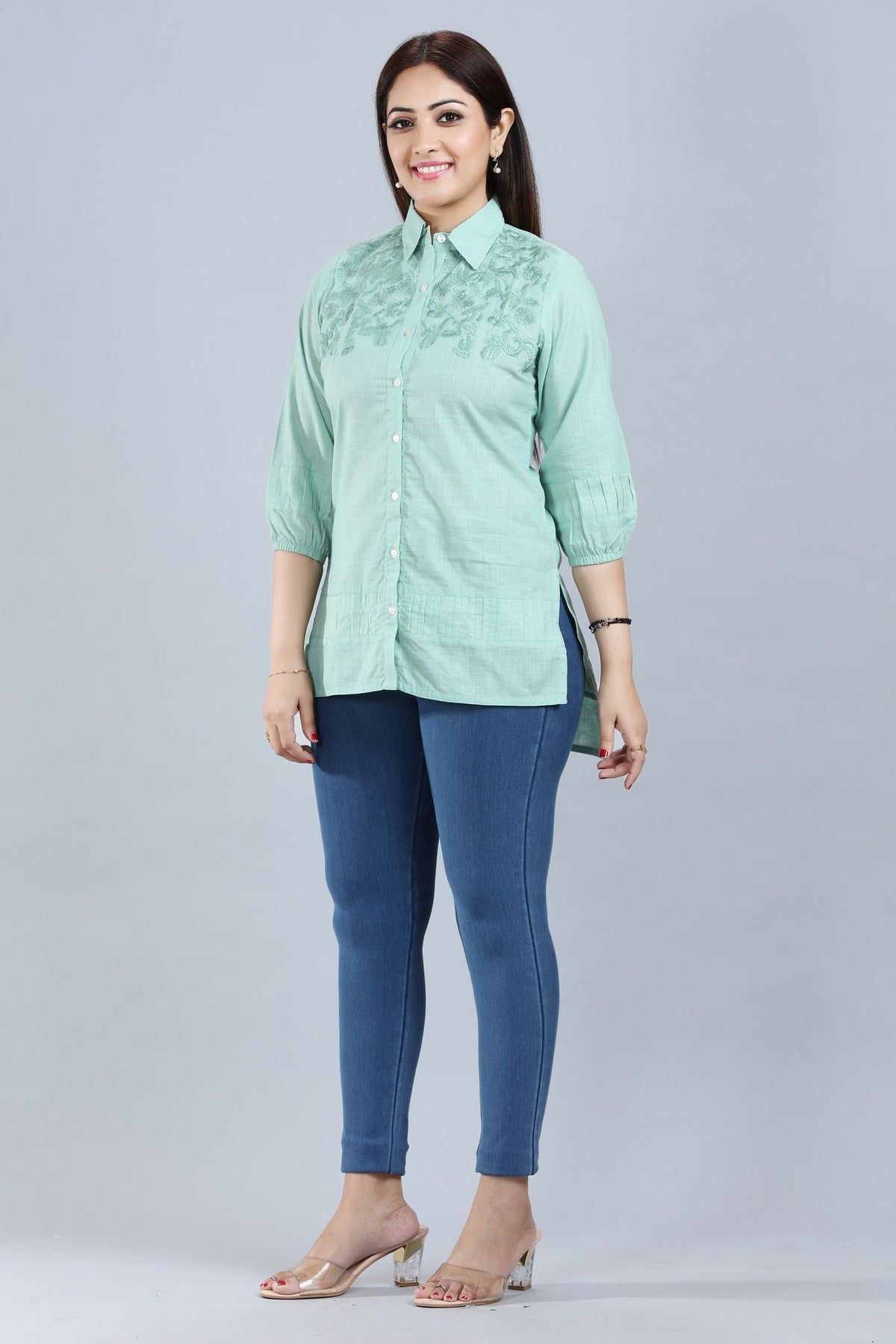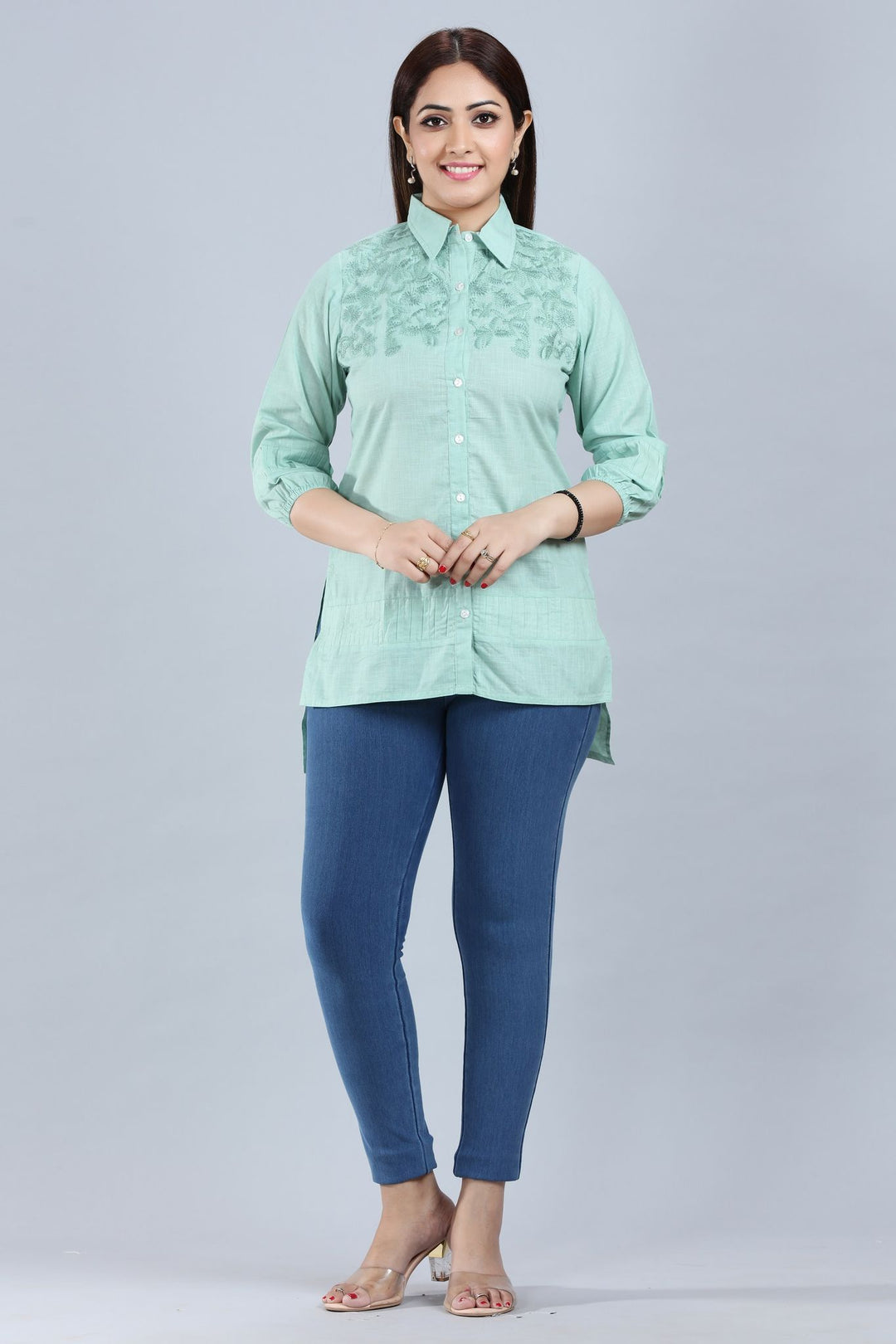 Womens Ethnic Wear featuring a high neck, three fourth sleeves and a regular fit. It is crafted from fine fabric.The model (height 5 ft 6 in) is wearing Size S