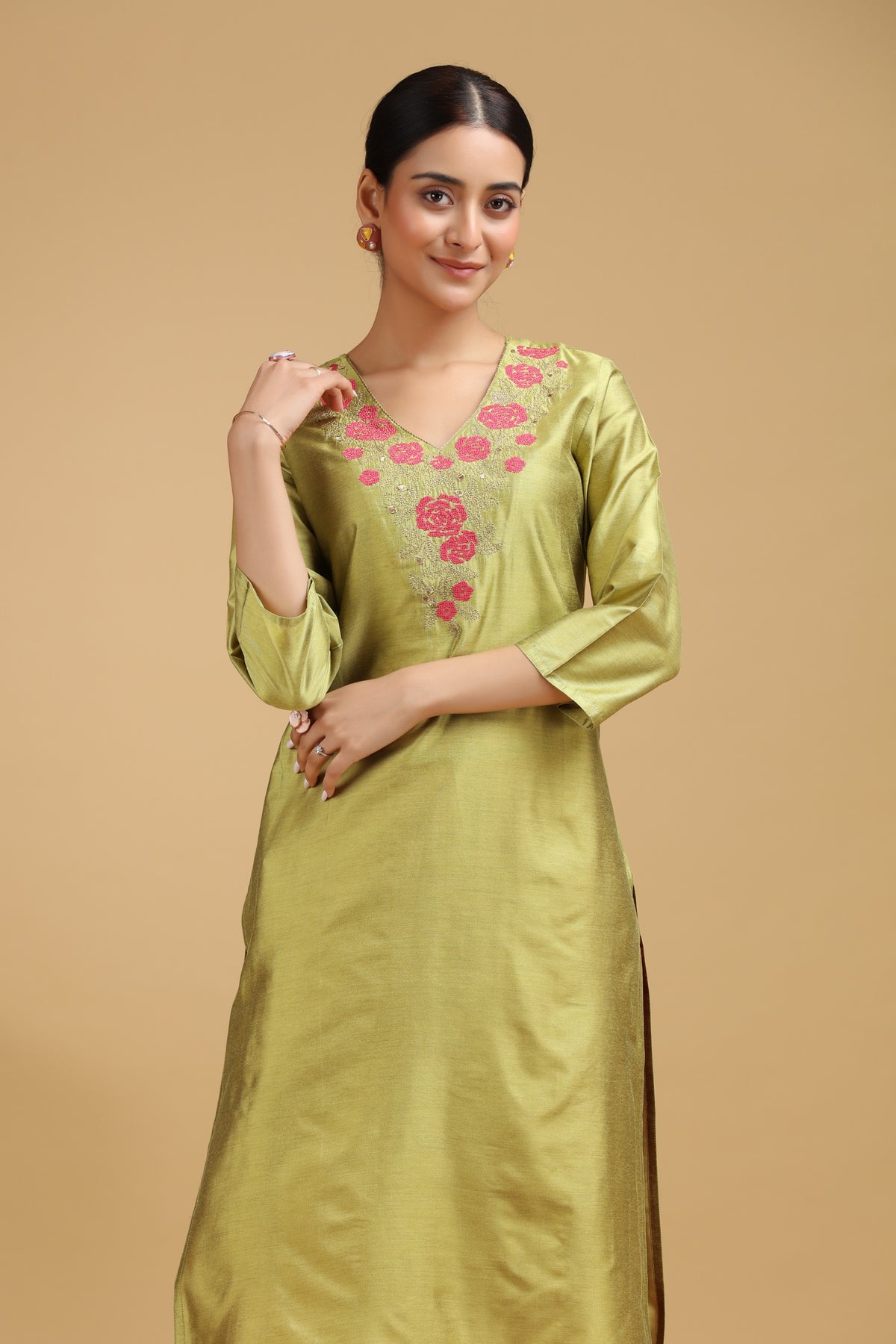 Elevate your ethnic wardrobe with this striking lime green straight kurta, meticulously crafted with intricate embroidery detailing. The vibrant hue offers a contemporary twist on traditional silhouettes, while the straight-cut design ensures comfortable, flattering wear throughout the day. Premium cotton construction provides breathability and durability, making it an ideal choice for both casual gatherings and festive occasions. The embroidered embellishments add sophisticated visual interest without overwhelming the clean lines of the garment. A versatile piece that pairs effortlessly with traditional bottoms or modern accessories.