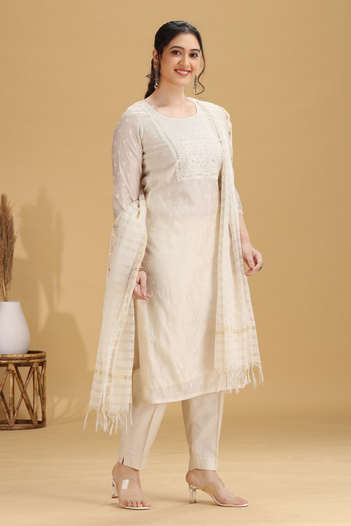 Elevate your ethnic wardrobe with this sophisticated off-white embroidered straight set. Crafted with meticulous attention to detail, the intricate embroidery work showcases traditional artistry while maintaining a contemporary silhouette. The straight-cut design offers a flattering, comfortable fit suitable for various occasions from festive celebrations to formal gatherings. Premium cotton construction ensures breathability and durability, making it an investment piece that withstands regular wear. Perfect for those who appreciate refined craftsmanship and timeless elegance in their traditional attire.