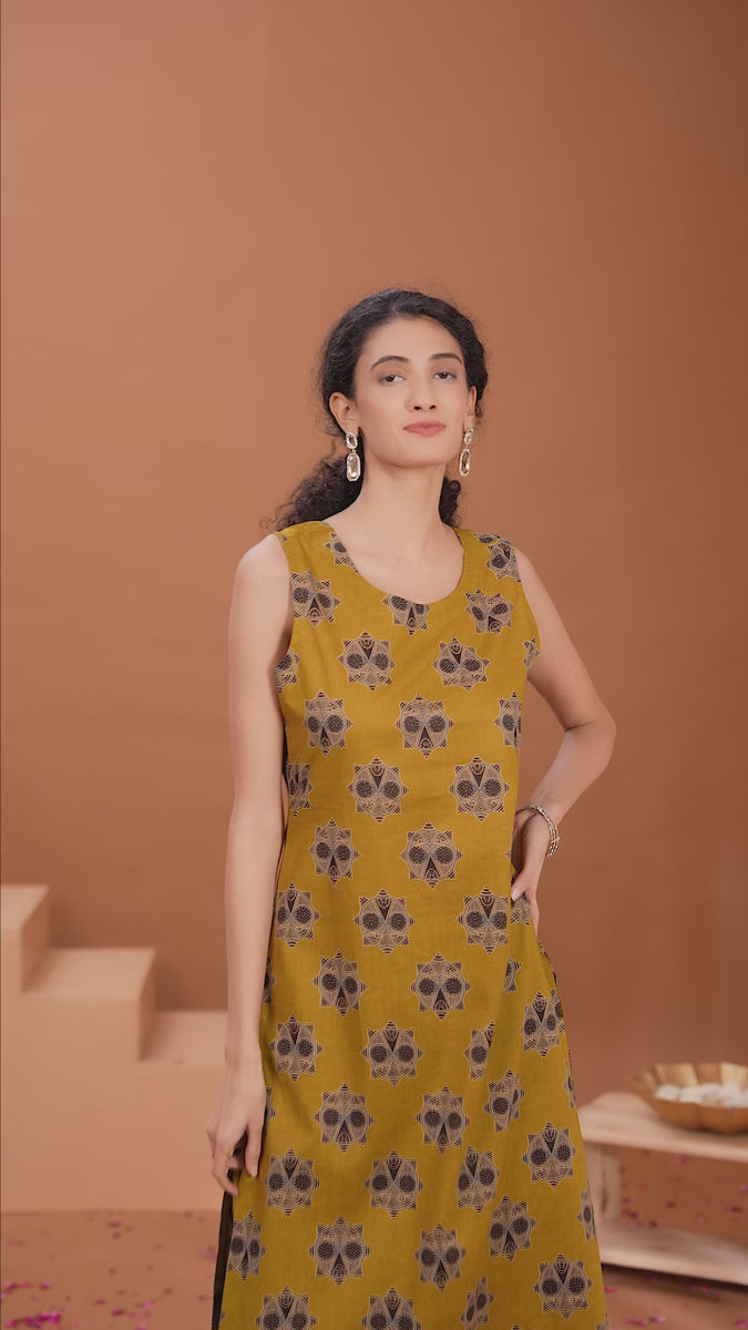 Designed for effortless elegance, this mustard floral printed cotton A-line co-ord set includes a sleeveless kurta with a round neck and coordinated pants. The breathable cotton fabric and graceful A-line silhouette provide comfort and style for daily wear.