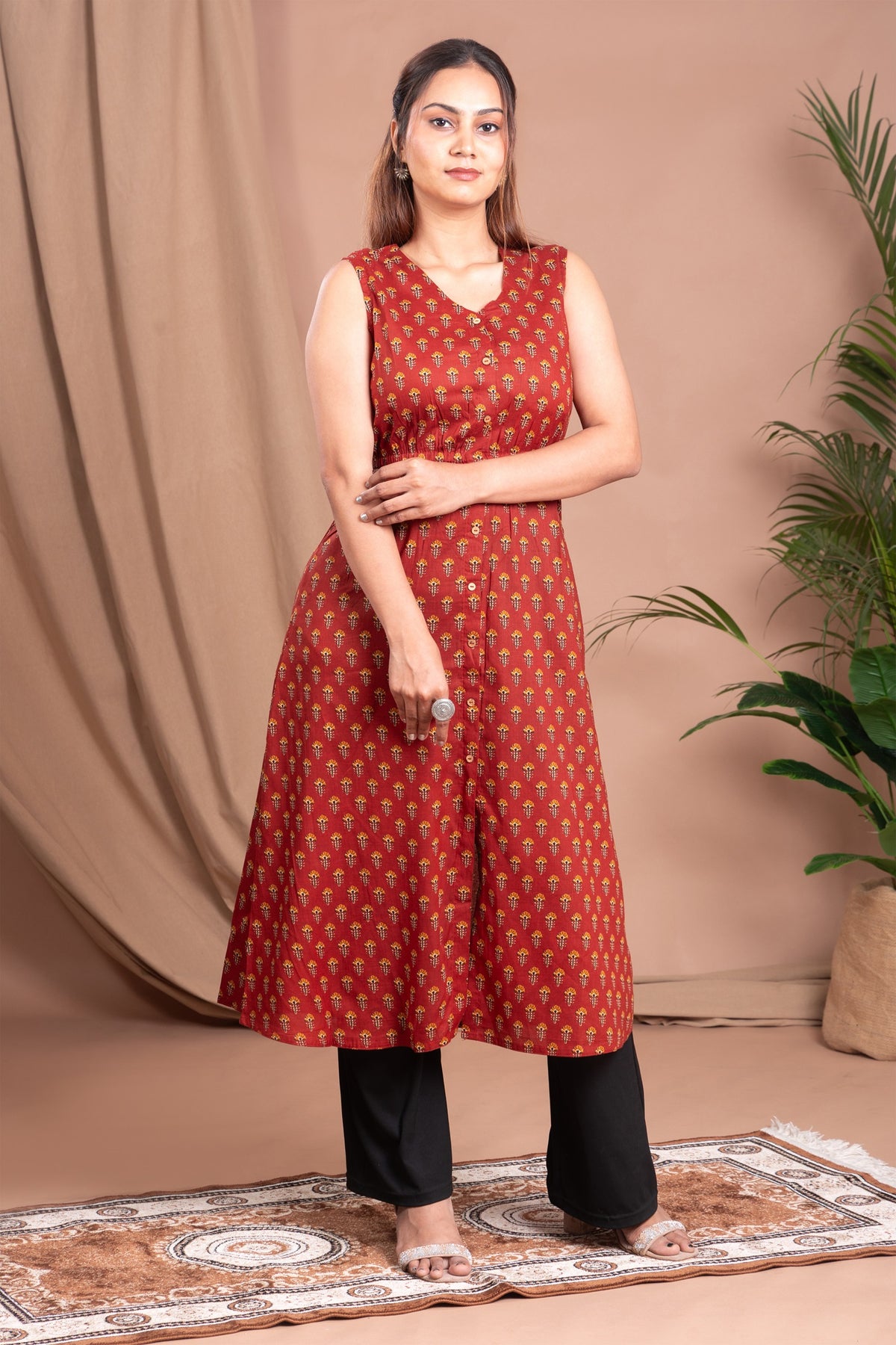 Our Rust Printed A-Line Cotton Kurta features a sleeveless design, breathable cotton fabric, and elegant all-over prints. The flattering A-line silhouette offers comfort and effortless style, making it perfect for casual outings and everyday wear.