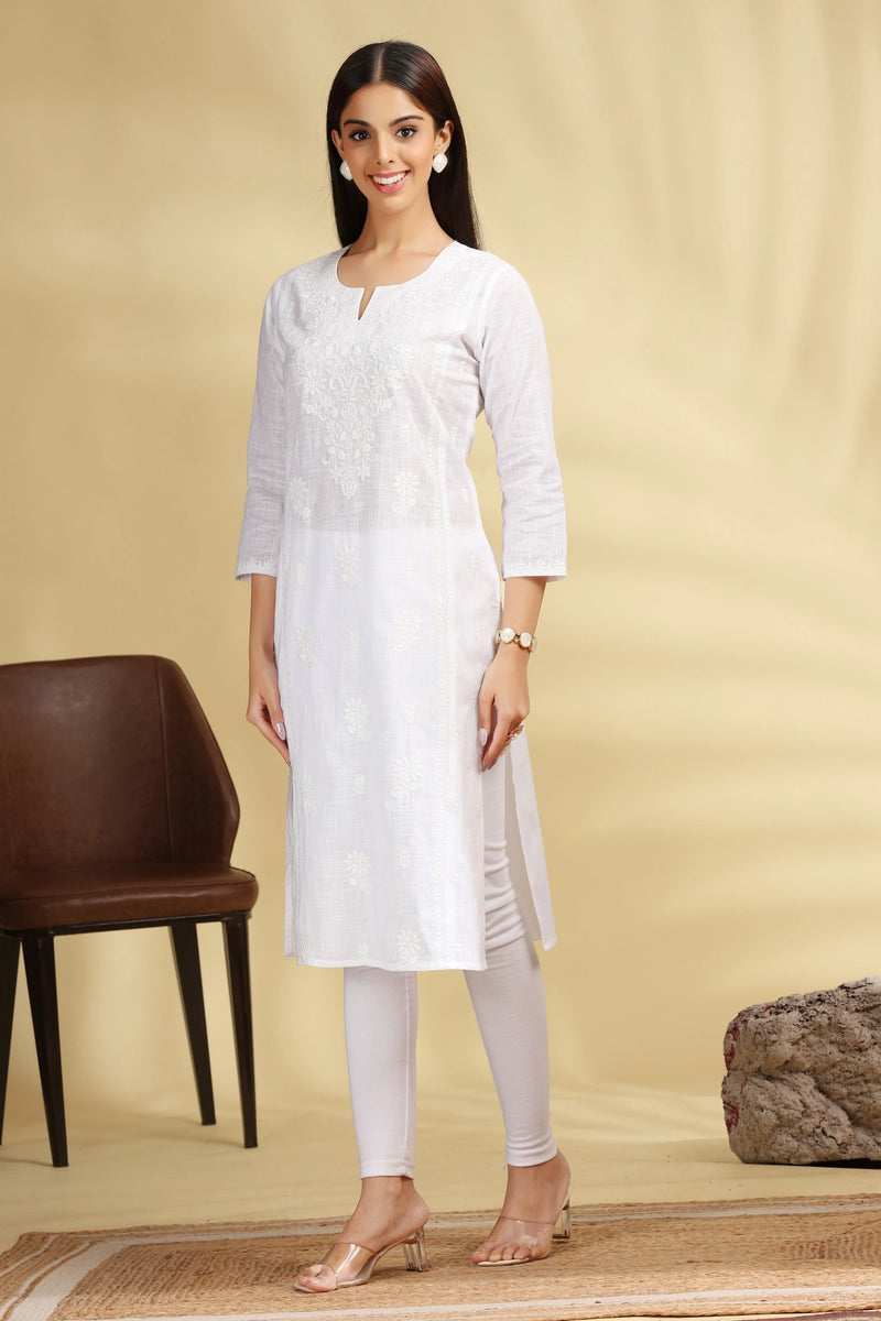 Stay cool and stylish in this White Embroidered Cotton Straight Kurta from Cotton Culture. Made from soft, breathable cotton, it keeps you comfortable all day long. The delicate embroidery adds a touch of elegance to its classic straight fit, making it perfect for both everyday wear and special occasions. Whether you're heading to work, a casual outing, or a festive event, this kurta is easy to wear and always looks graceful. A timeless piece you'll keep reaching for.
