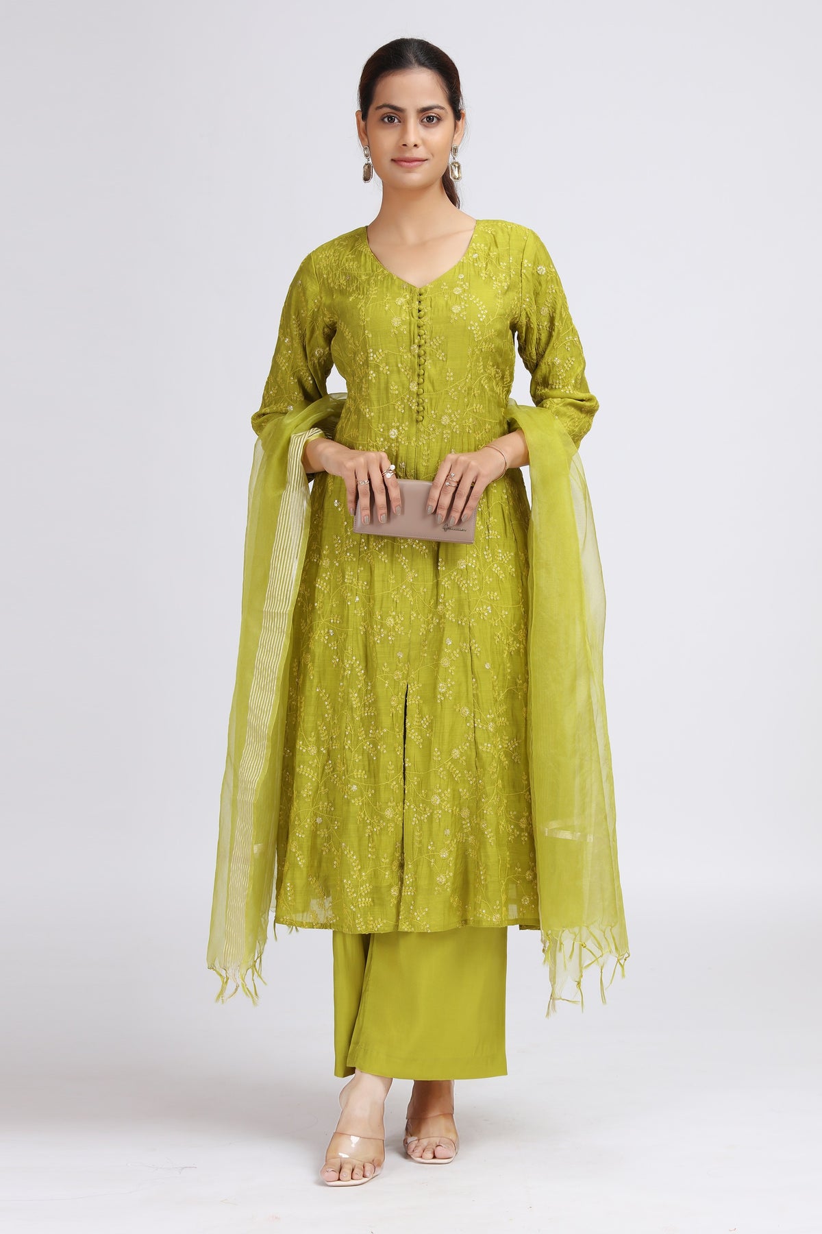 Lime Green Chanderi Embroidered A Line Kurta Pant and Dupatta Suit Set