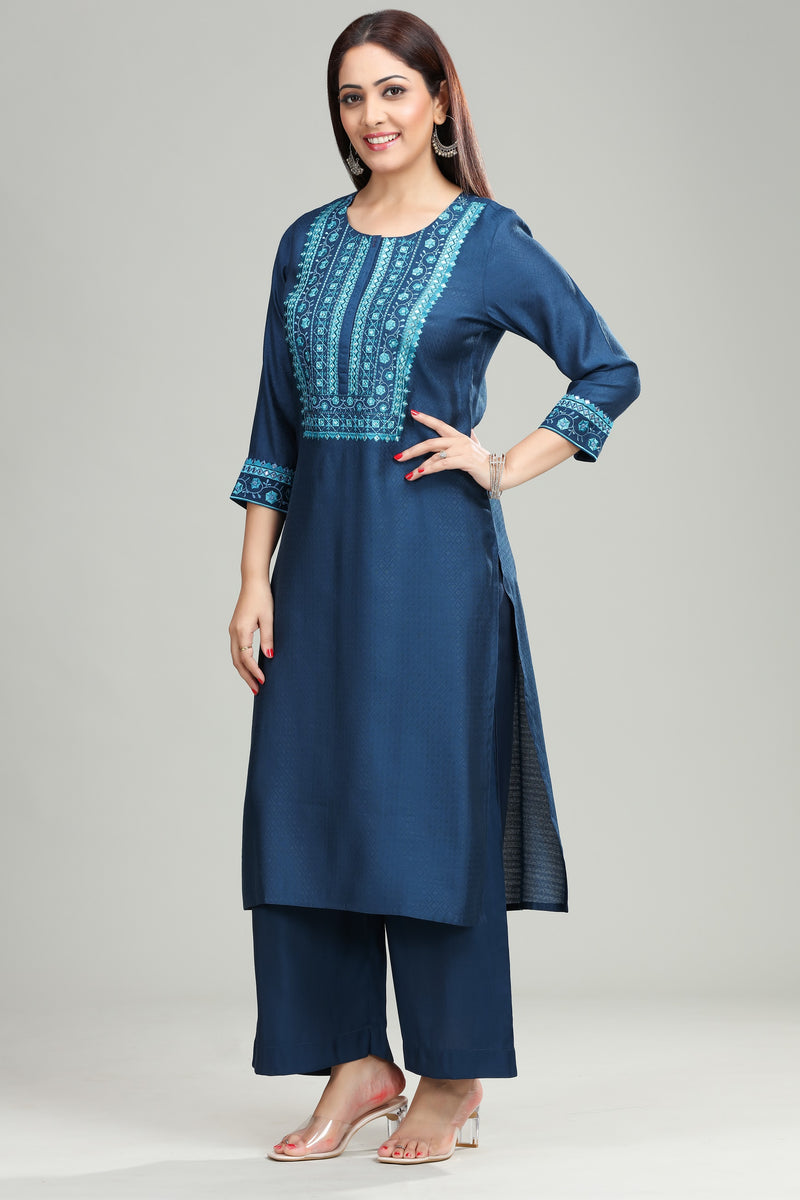 Blue Silk Straight Embroidered Kurta Pant Co ord Set