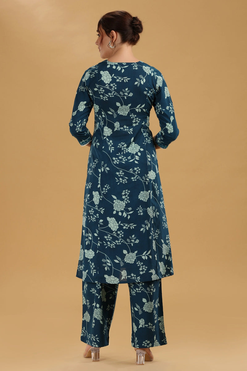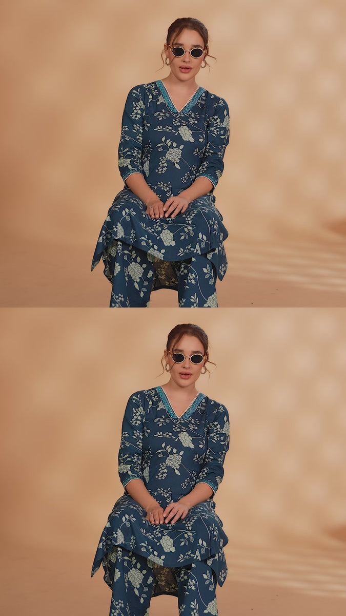 Indigo Blue Flex Cotton Floral Printed A Line Kurta Pant Co ord Set
