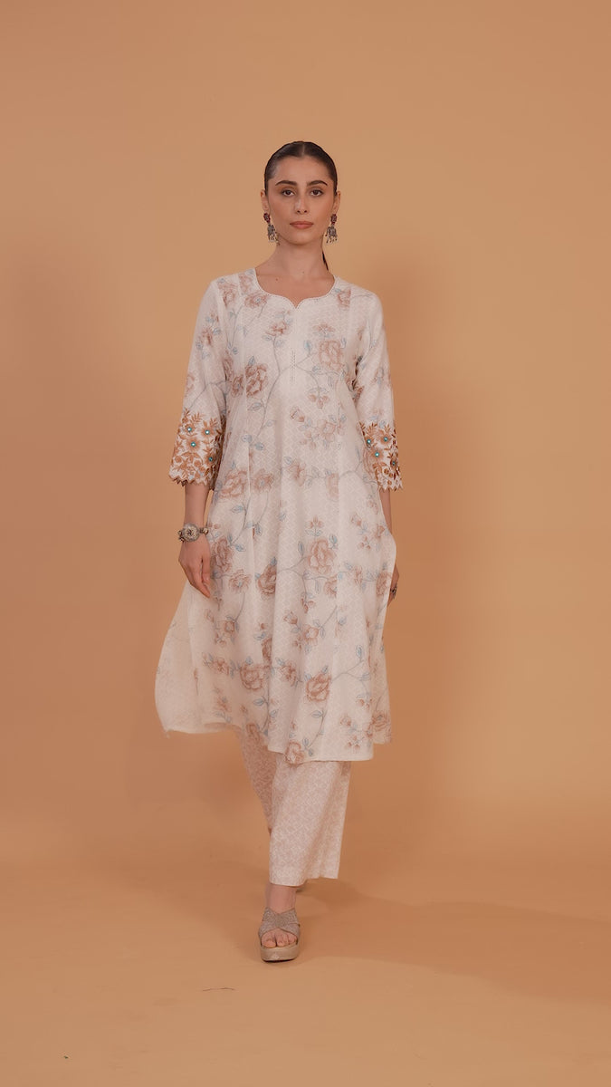 Off White & Beige Cotton Flex Embroidered Straight Kurta Pant Co ord Set