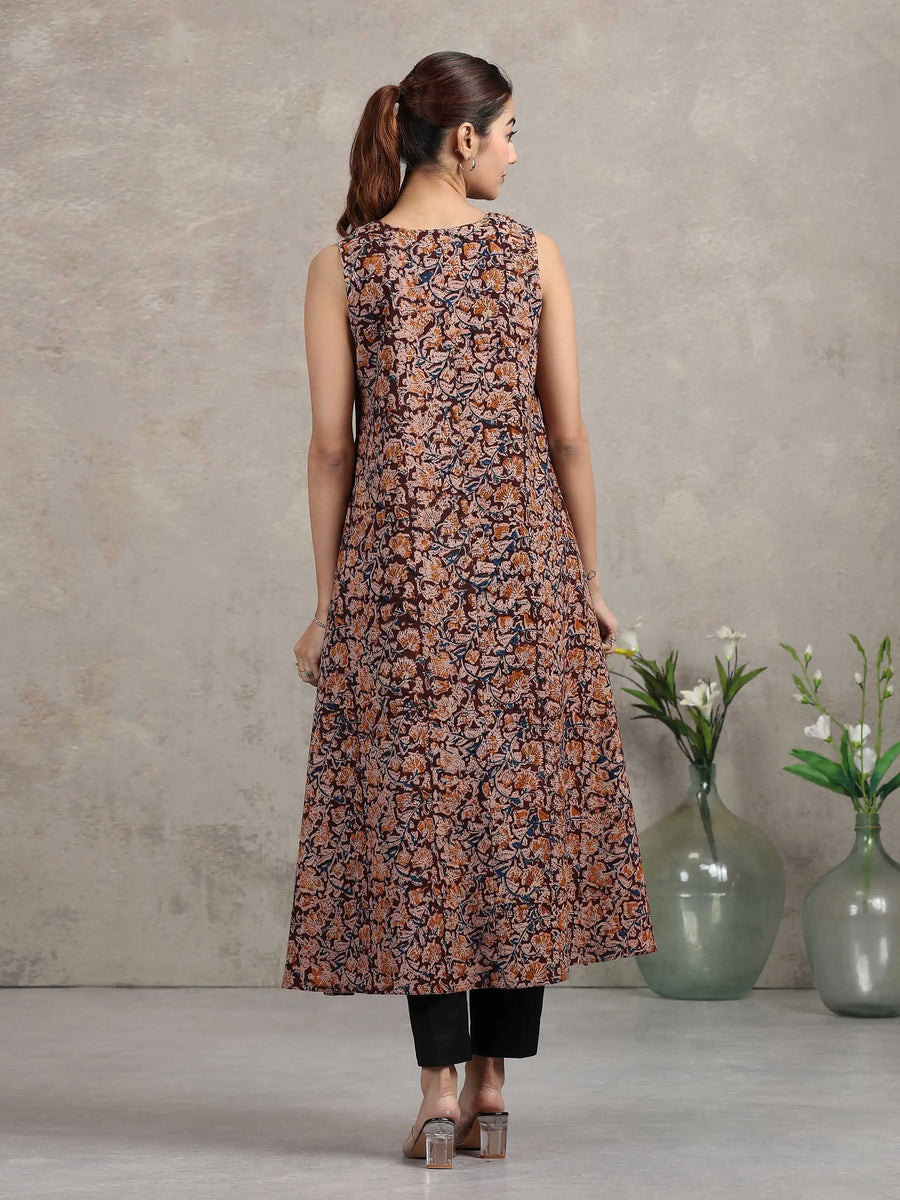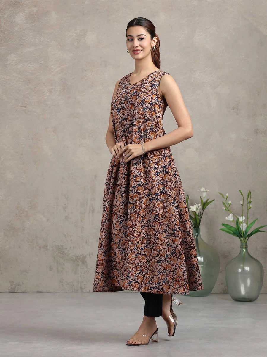 Beige Jaipuri Printed Cotton A-Line Kurta