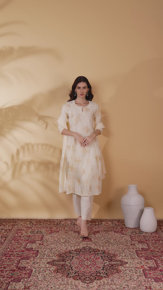 Cream Cotton Embroidered A Line Kurta Pant and Dupatta Suit Set