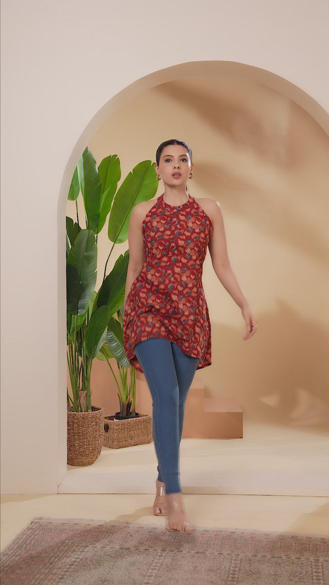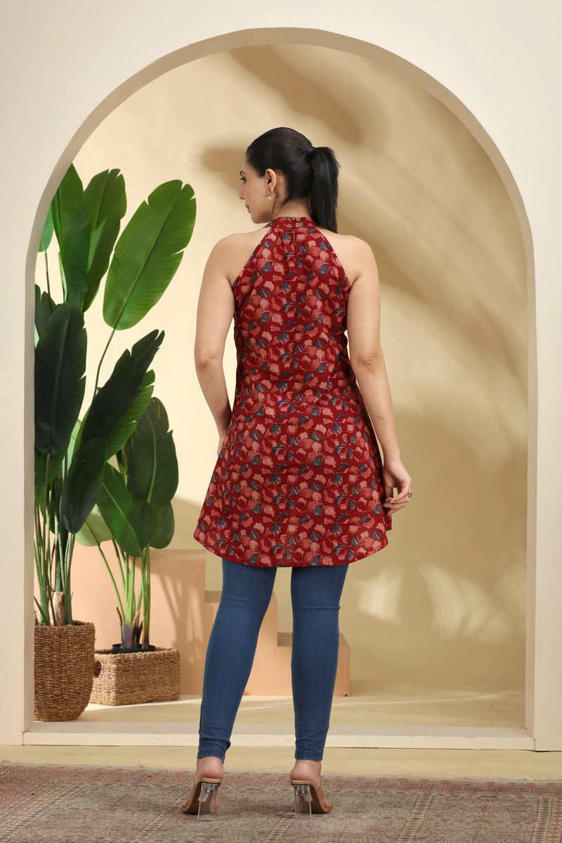 Maroon printed A-line cotton tunic featuring a stylish halter neck and sleeveless design. Thigh-length with all-over prints perfect for comfortable and elegant office wear.