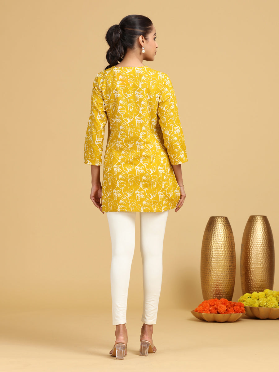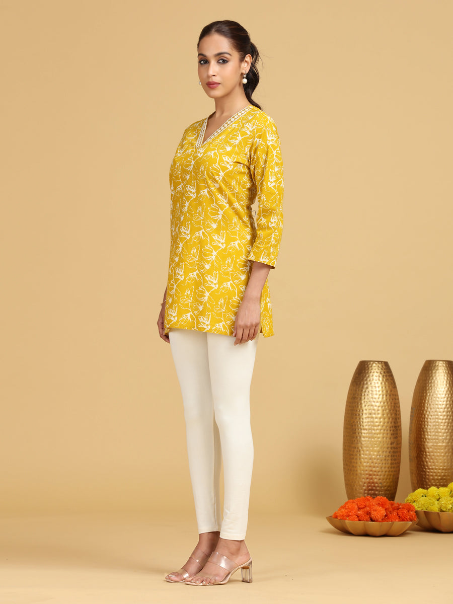 Yellow floral printed straight tunic featuring a flattering V-neck, 3/4 sleeves, and an elegant all-over floral print perfect for comfortable everyday wear, office looks, and casual outings.