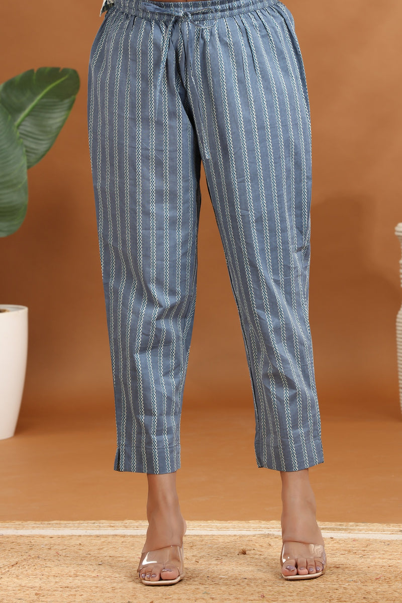 Sky Blue & Off White Jaipuri Cotton A Line Printed Kurta Pants and Dupatta Set