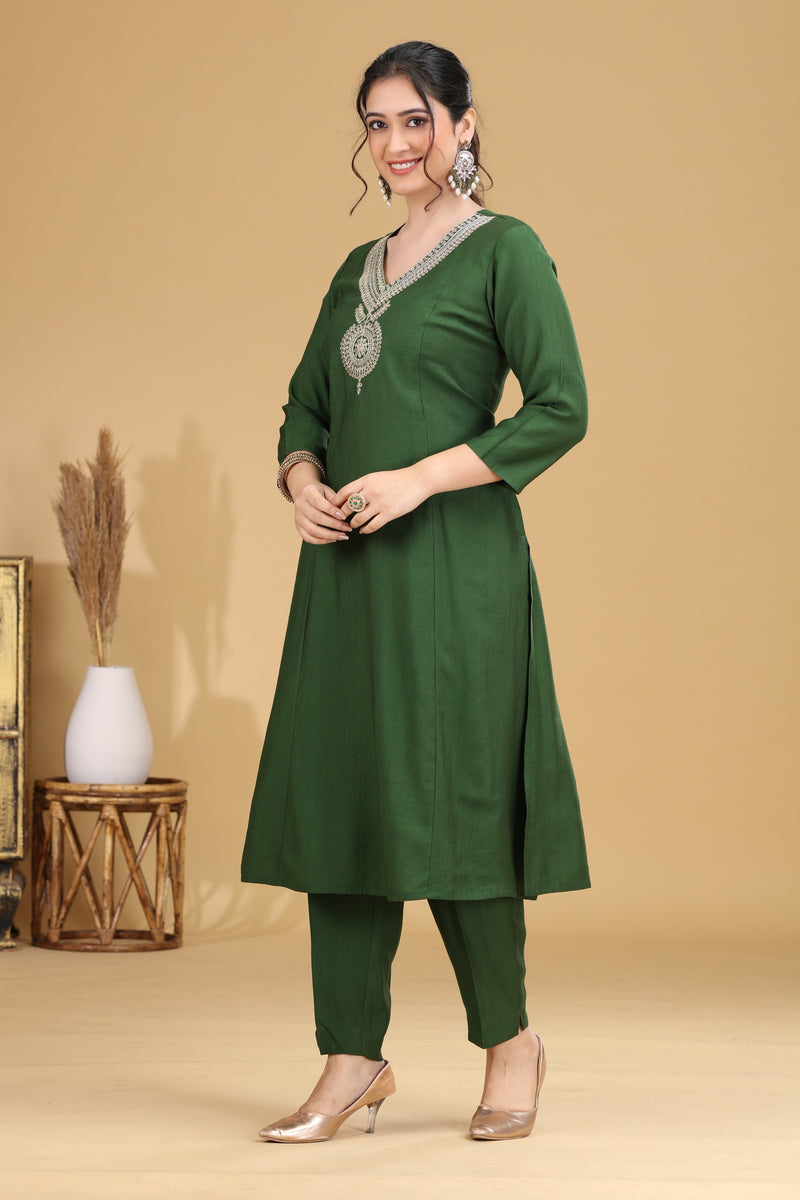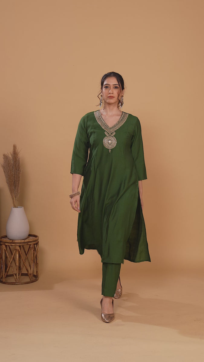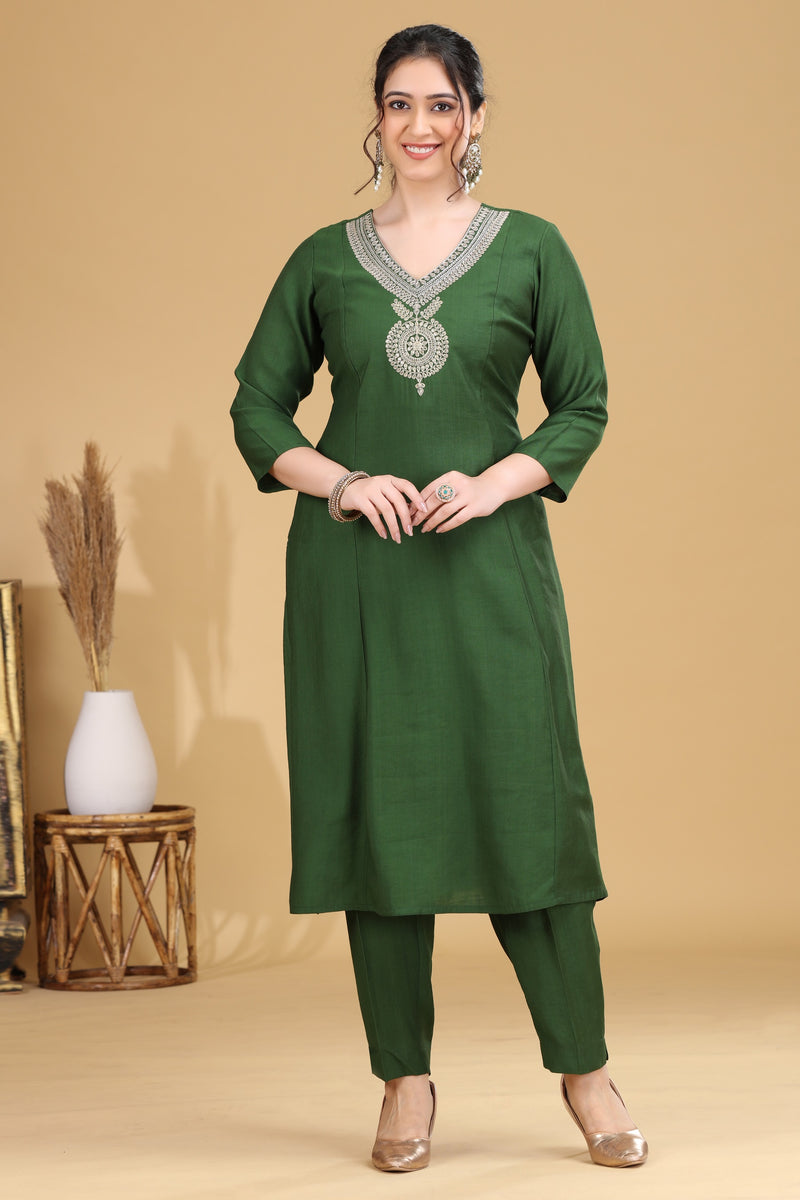 Green Embroidered Straight Co ord Set