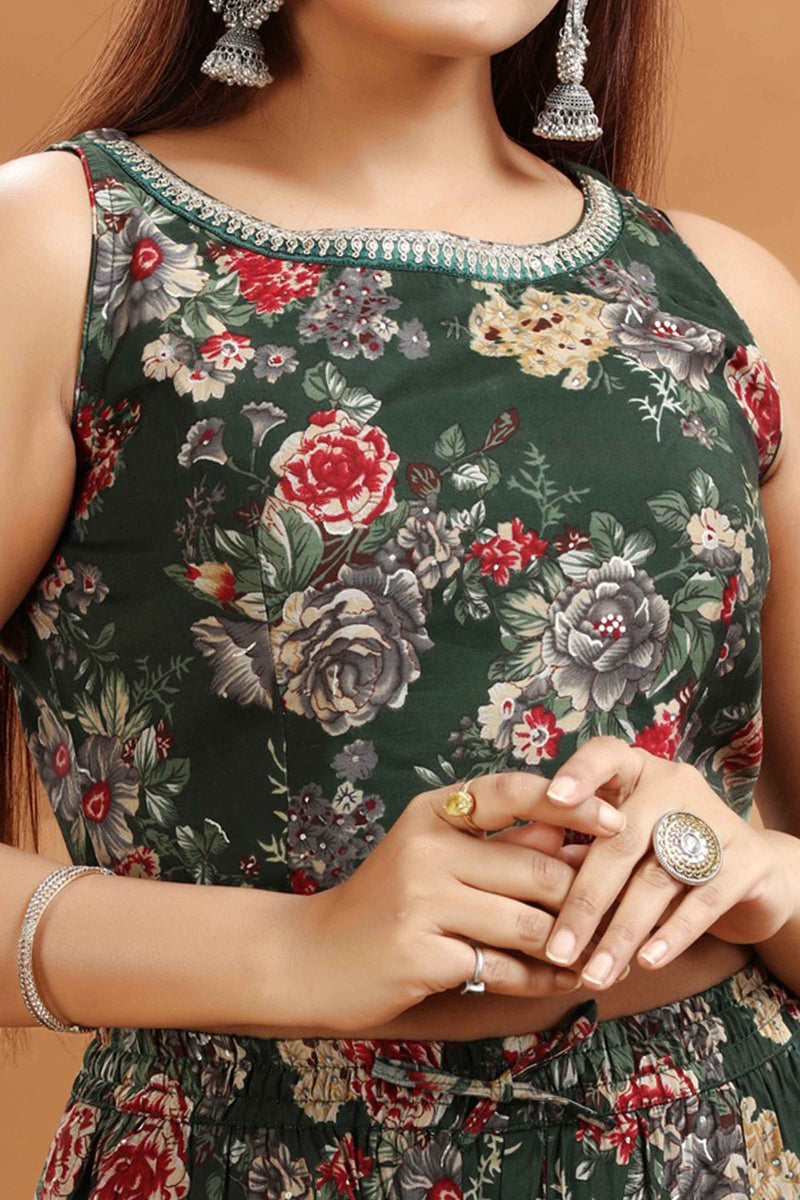 Green & Maroon Roman Silk Chanderi A Line Printed Kurta Pant Co ord Set