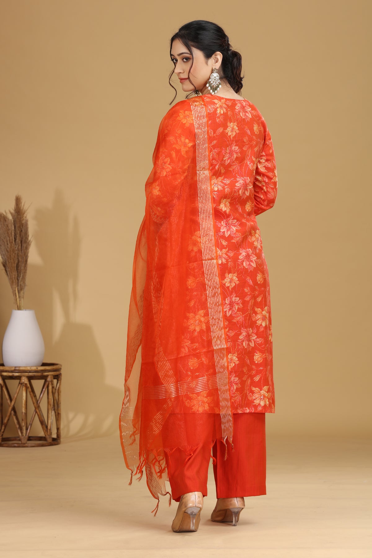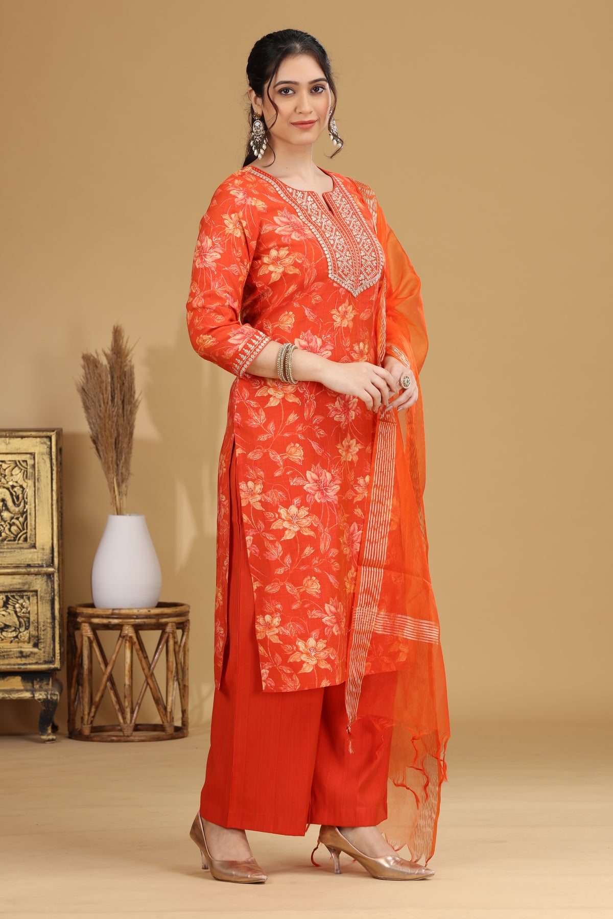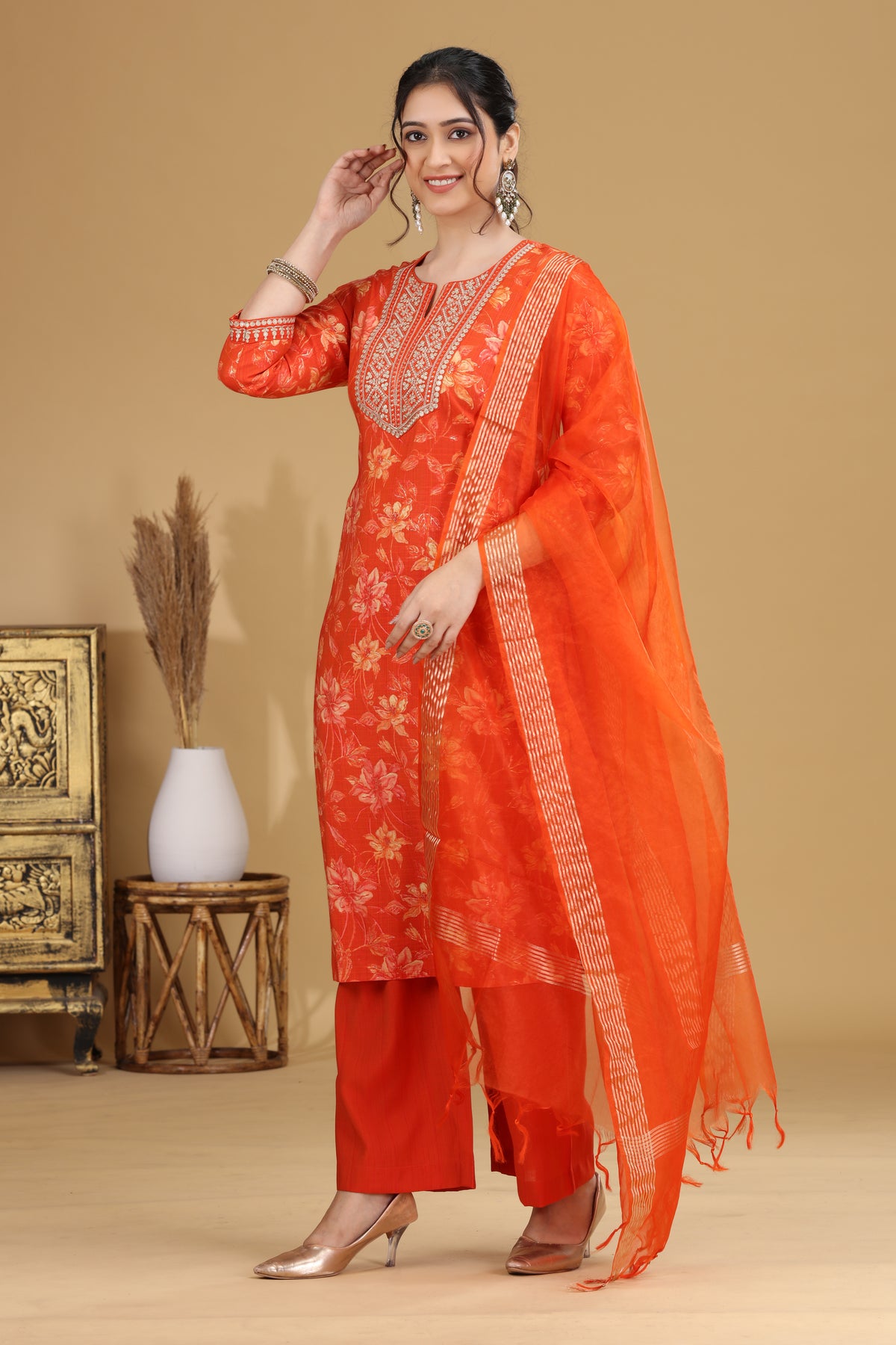 Elevate your ethnic wardrobe with this striking orange ensemble, featuring intricate floral embroidery that showcases traditional craftsmanship. The straight silhouette offers a timeless, flattering fit suitable for festive occasions, cultural celebrations, or elevated everyday wear. Crafted with attention to detail, the embroidered motifs add depth and sophistication to the vibrant orange base. This versatile set seamlessly transitions from daytime gatherings to evening events, making it an essential addition for those who appreciate authentic ethnic fashion with contemporary appeal.