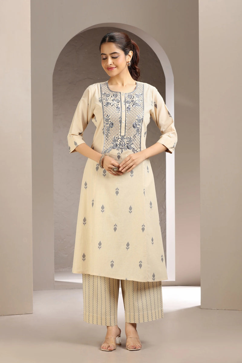 Beige Handloom Cotton Embroidered Straight Kurta and Pant Set