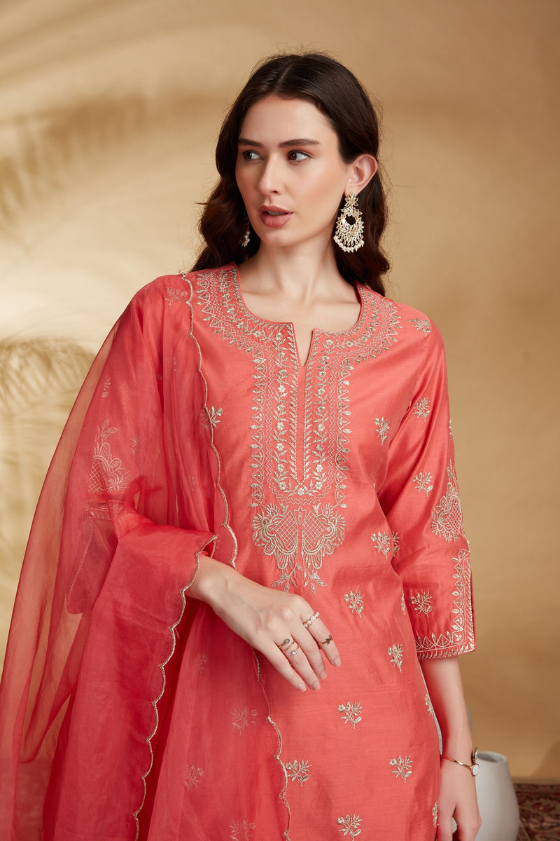 Peach Chanderi Embroidered Straight Kurta Pant and Dupatta Suit Set