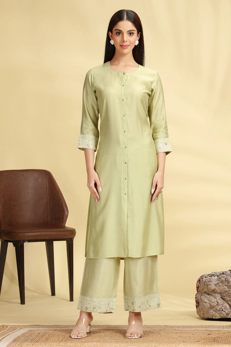 Pista Green Poly Silk Embroidered Straight Kurta Pant Co ord Set