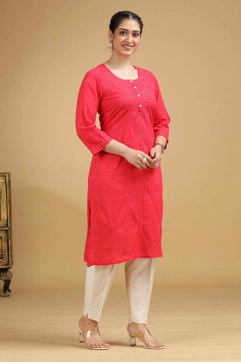 Soft pink cotton straight kurta adorned with delicate Lucknowi style chikankari embroidery. Designed with a neat round neckline and easy 3/4 sleeves this breathable and lightweight kurti offers understated elegance perfect for daily wear office dressing and subtle festive styling.
