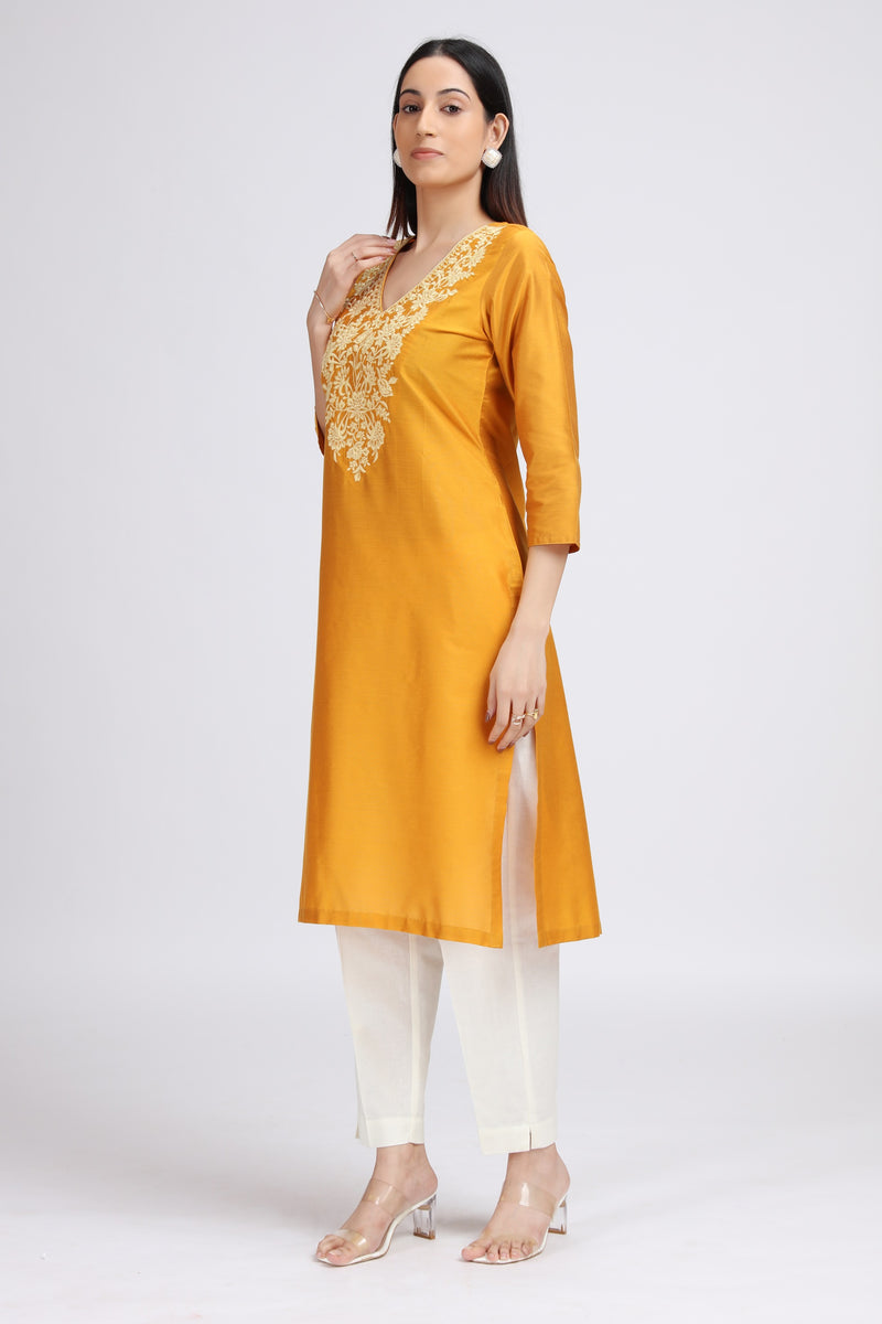This yellow floral embroidered straight kurta represents thoughtful design meets everyday practicality. Constructed from breathable cotton, it features meticulously detailed floral embroidery that reflects artisanal excellence. The relaxed straight-cut silhouette provides unrestricted movement while maintaining a polished appearance suitable for multiple occasions from casual outings to semi-formal gatherings. The warm yellow tone offers natural luminosity and pairs effortlessly with traditional or contemporary bottoms. The embroidery work showcases fine attention to detail, elevating this piece beyond basic everyday wear. An investment in quality cotton craftsmanship that delivers both comfort and style.