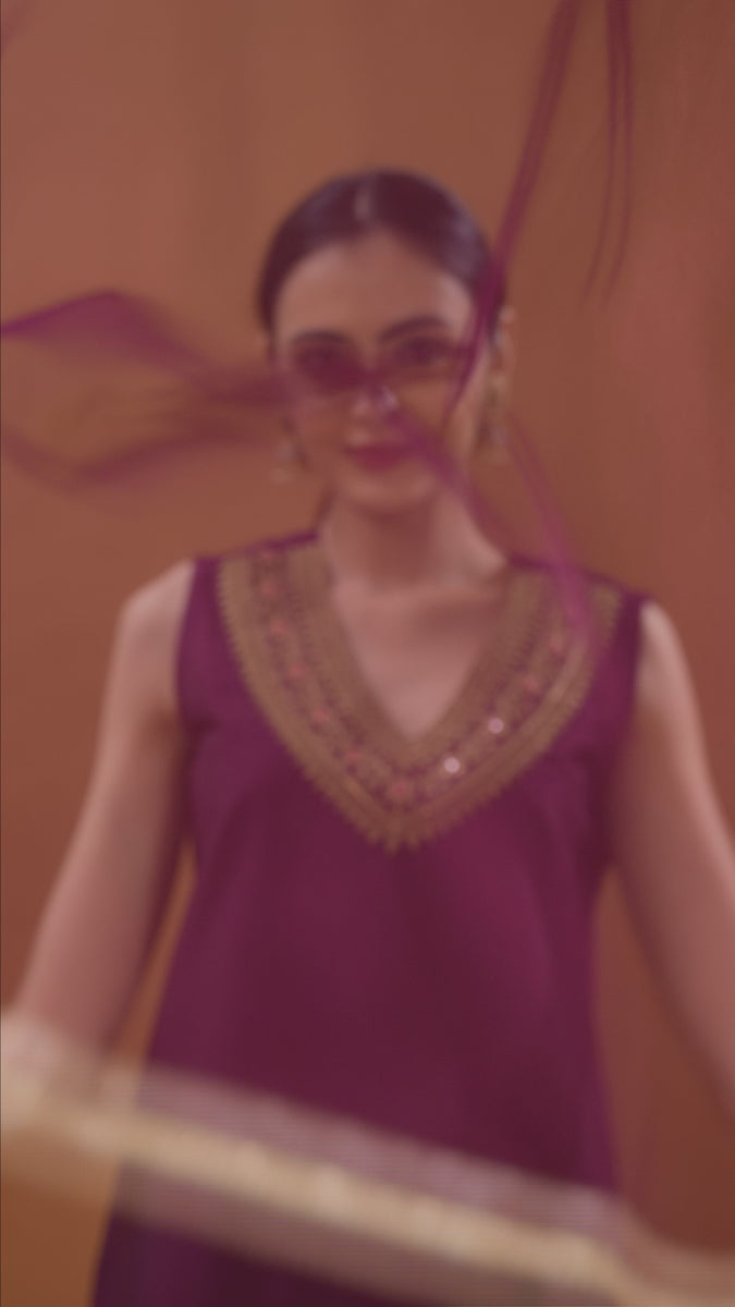 Wine Embroidered Straight Ethnic Set featuring a sleeveless kurta with elegant V-neck embroidery, paired with comfortable palazzo pants and a matching dupatta perfect for festive and occasion wear.