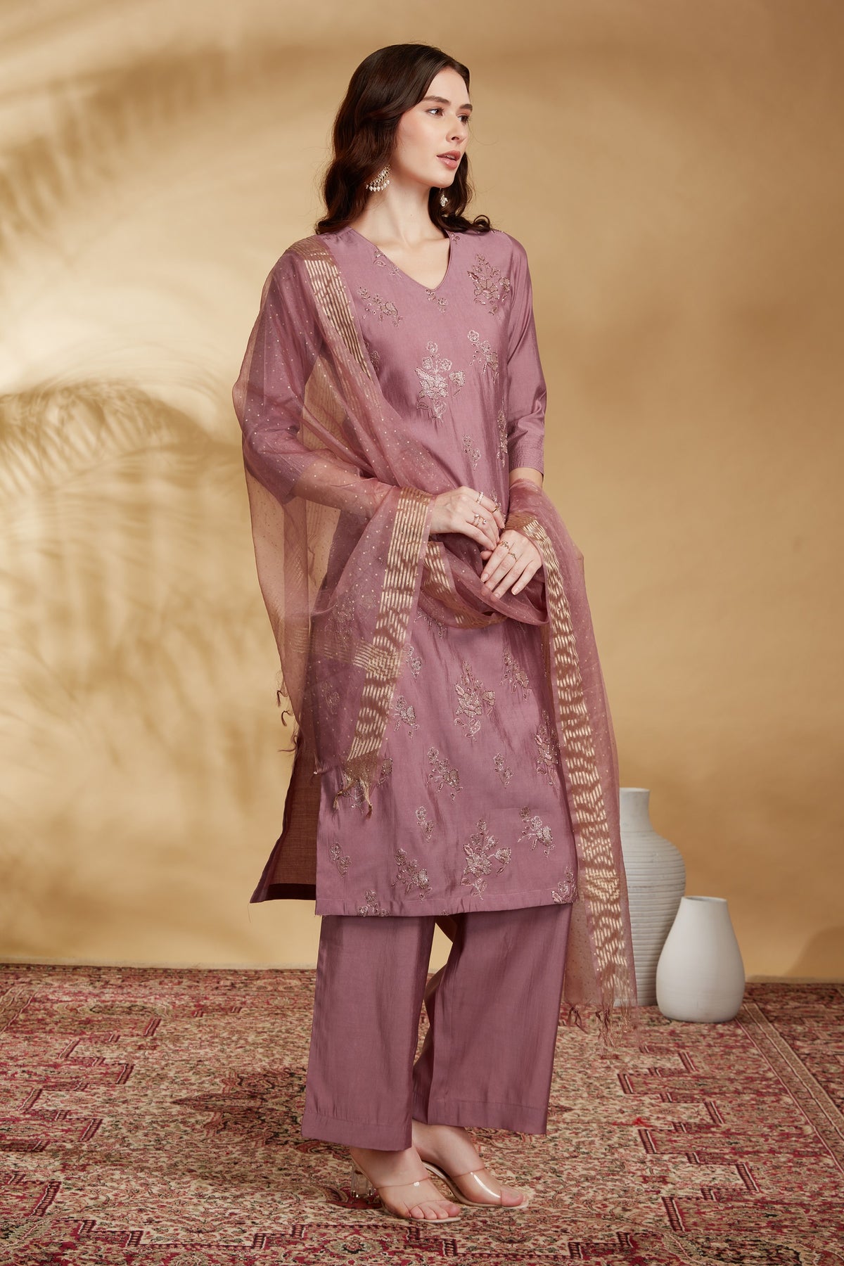 Light Purple Roman Silk Embroidered Straight Kurta Pant and Dupatta Suit Set