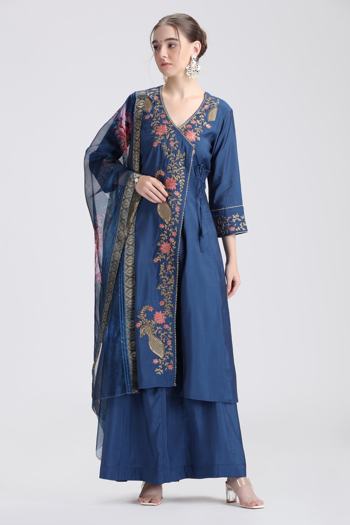 Royal Blue Roman Silk Embroidered A Line Kurta and Dupatta Set