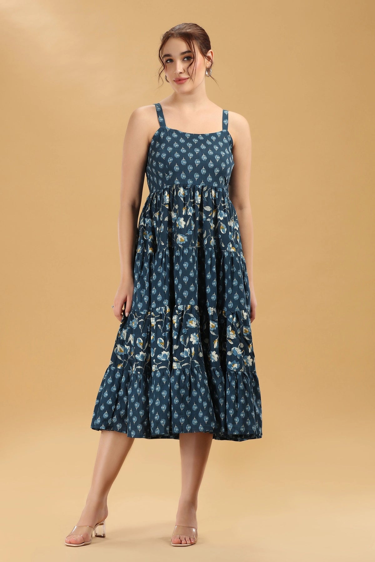 Navy Blue Floral Printed Tiered Cotton Flare Dress