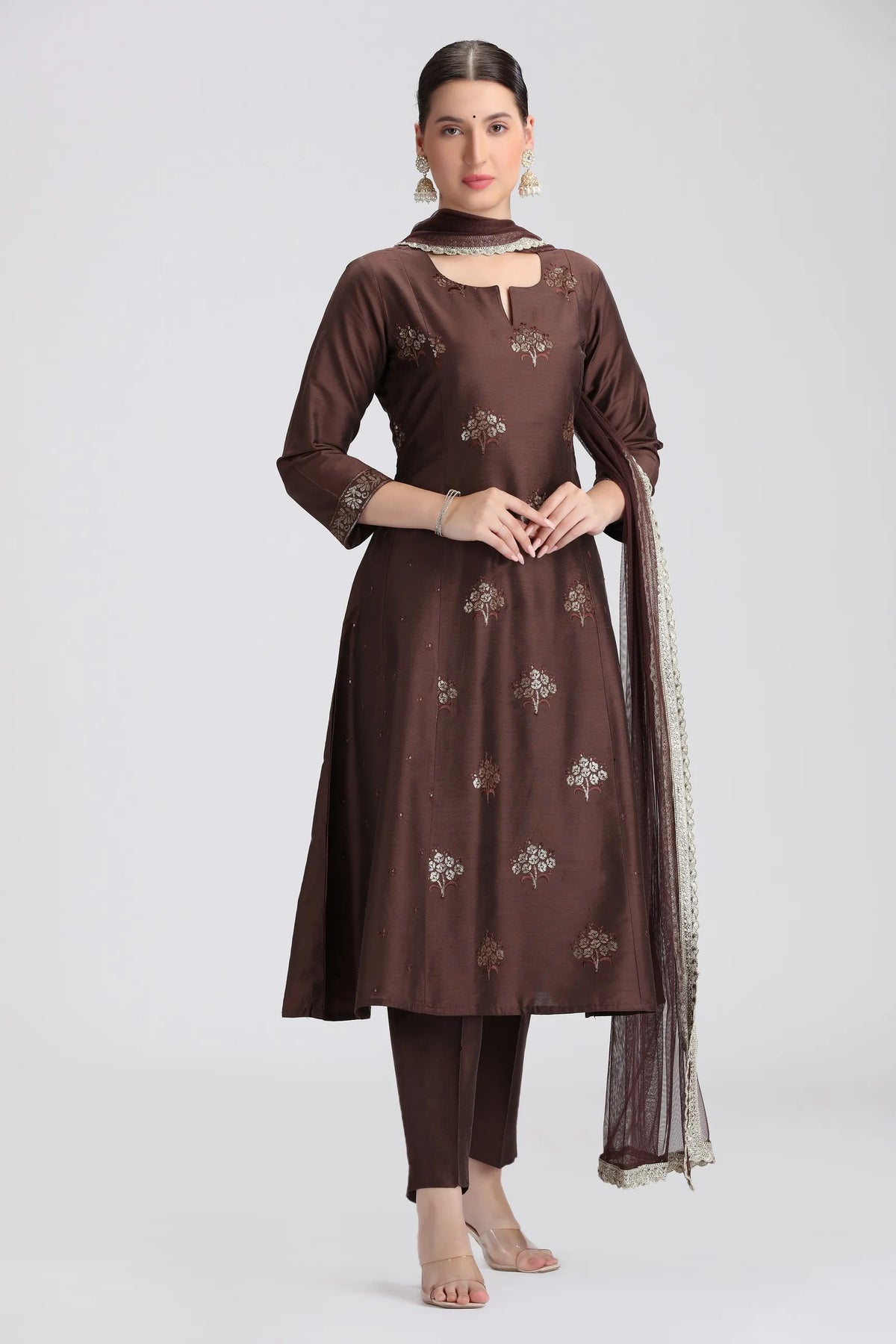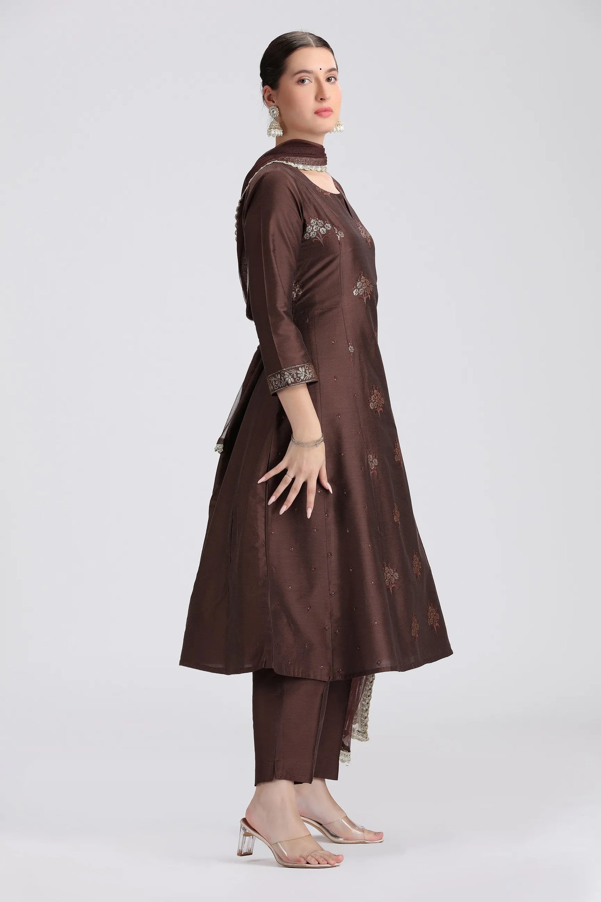 Brown PolySilk Embroidered A Line Kurta Pant and Dupatta Suit Set