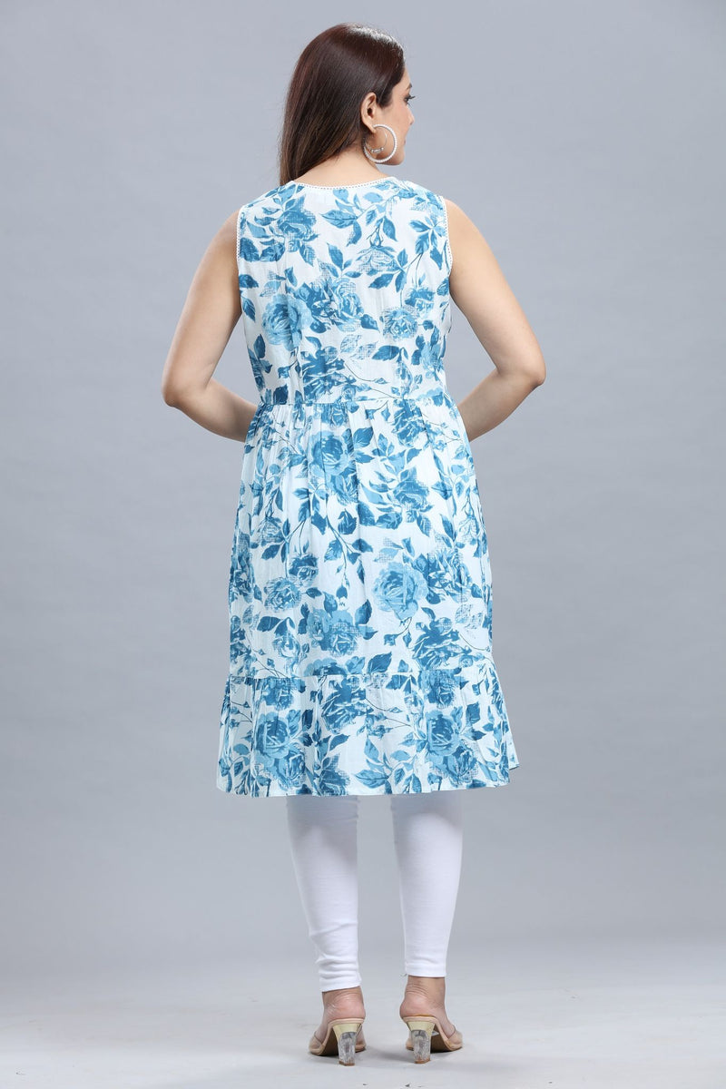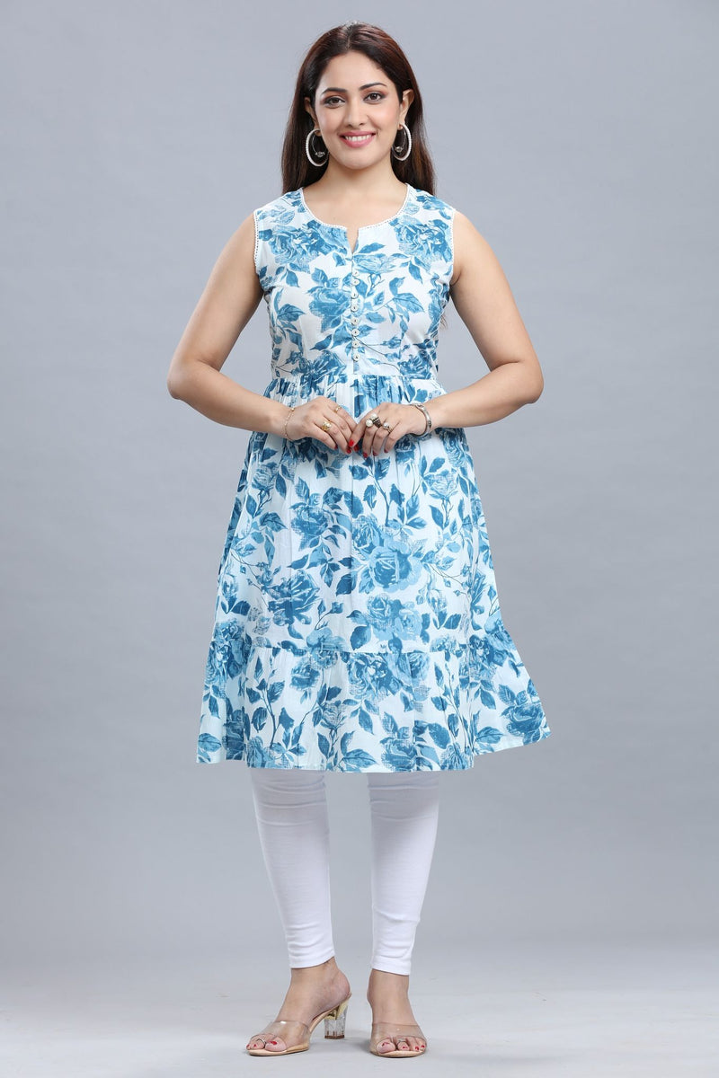 Sky Blue Jaipuri Cotton Printed Sleeveless Kurta