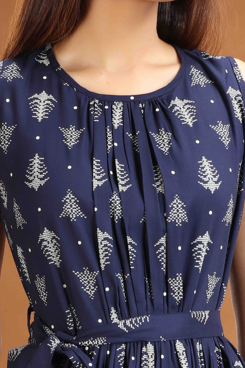Navy Blue Cotton Printed A-Line Dress with Belt
