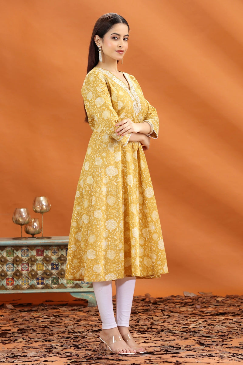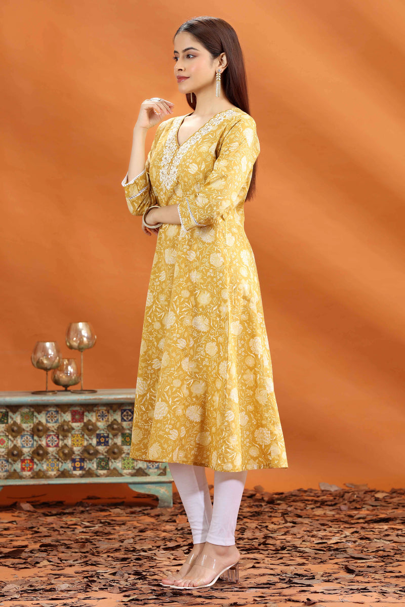 Yellow Jaipuri Cotton A Line Embroidered Kurta