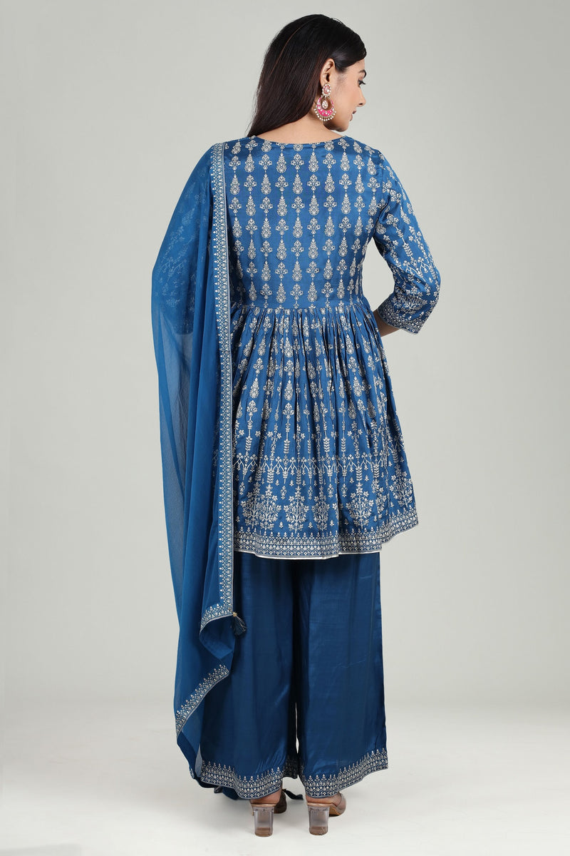 Indigo Blue Cotton Flared Printed Kurta Pant Suit Set