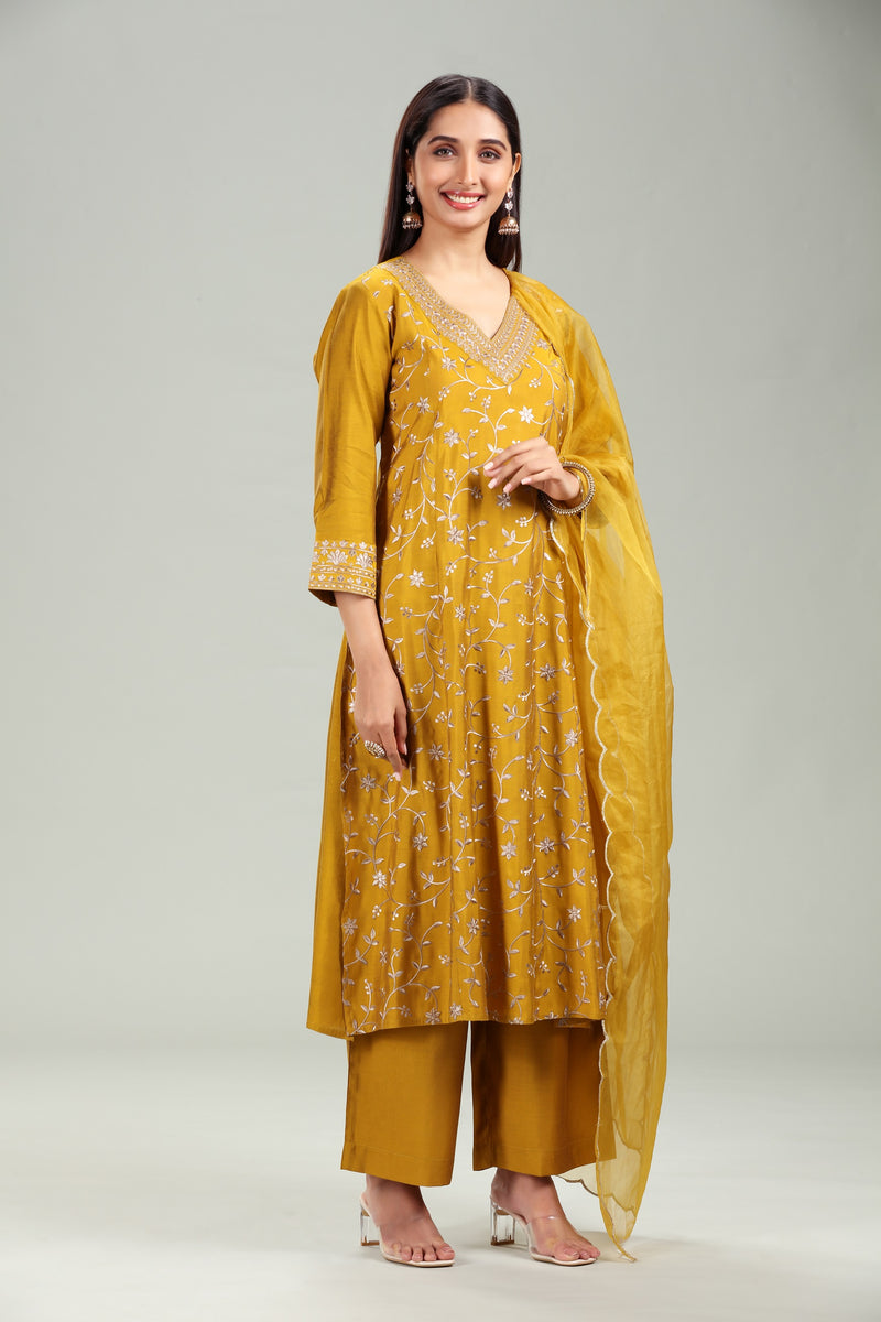 Mustard PolySilk Embroidered A Line Kurta Pant Suit Set