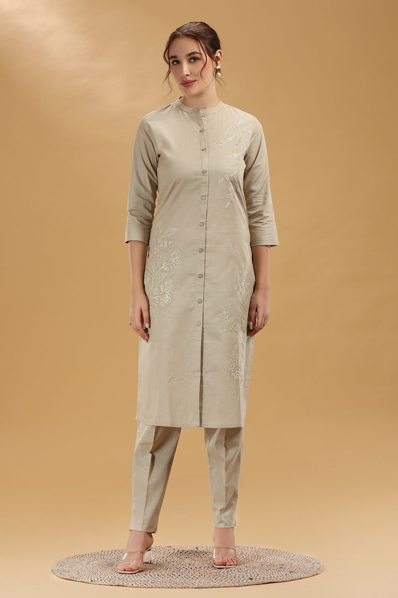 Beige Emboridered Flax Cotton A Line Kurta Pant Co ord Set