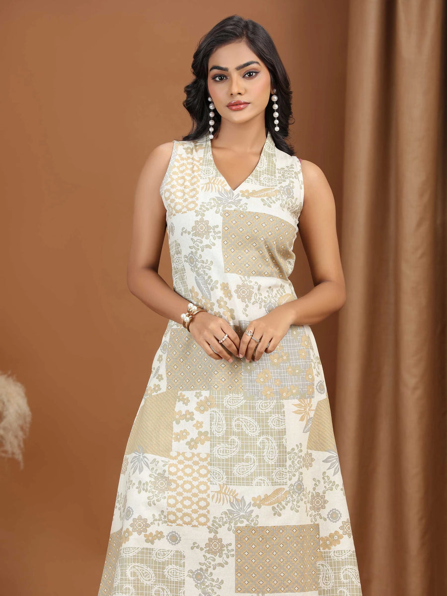 Soft beige tones with delicate floral prints. This cotton A-line co-ord set offers a breezy, flattering fit perfect for effortless everyday elegance. Pair with minimal jewelry, flats & a fresh natural look for easy, graceful style.