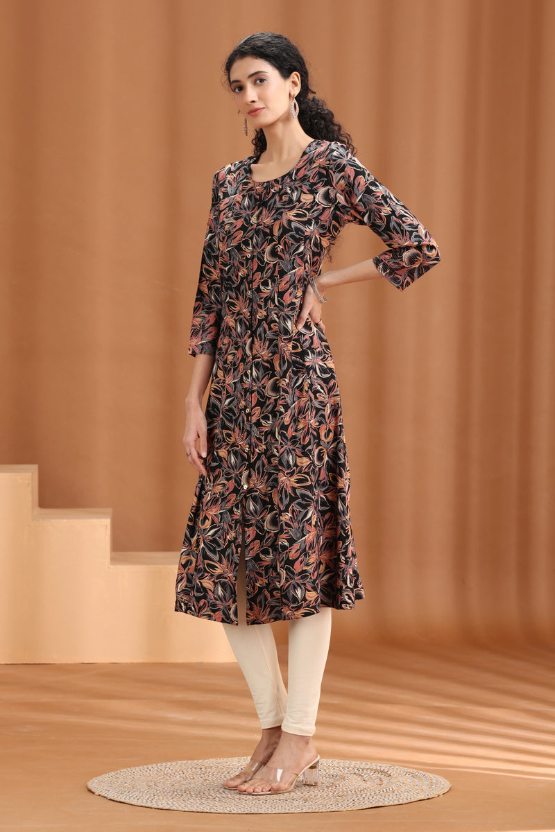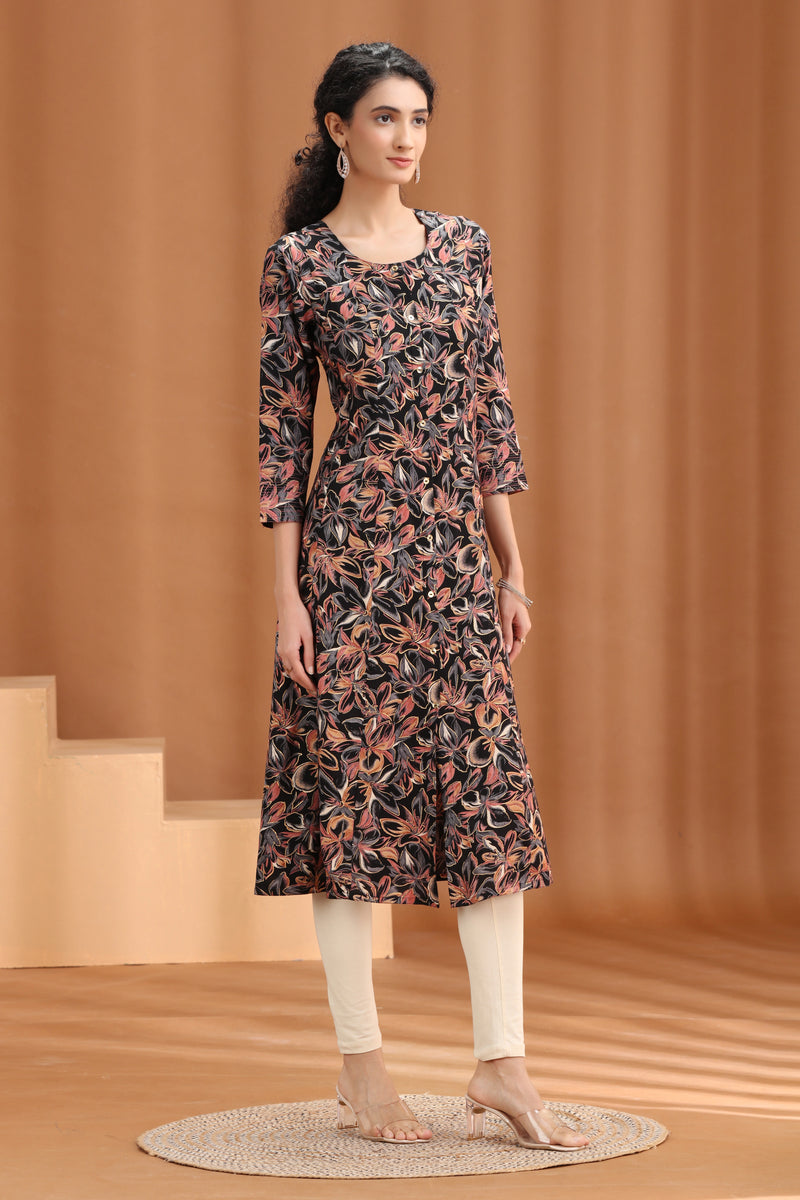 This black floral pattern A-line kurta from Cotton Culture features a classic round neck and comfortable 3/4 sleeves. Designed with a flattering silhouette it offers effortless elegance for everyday wear office wear and casual outings.