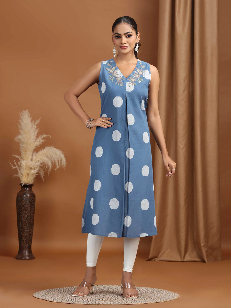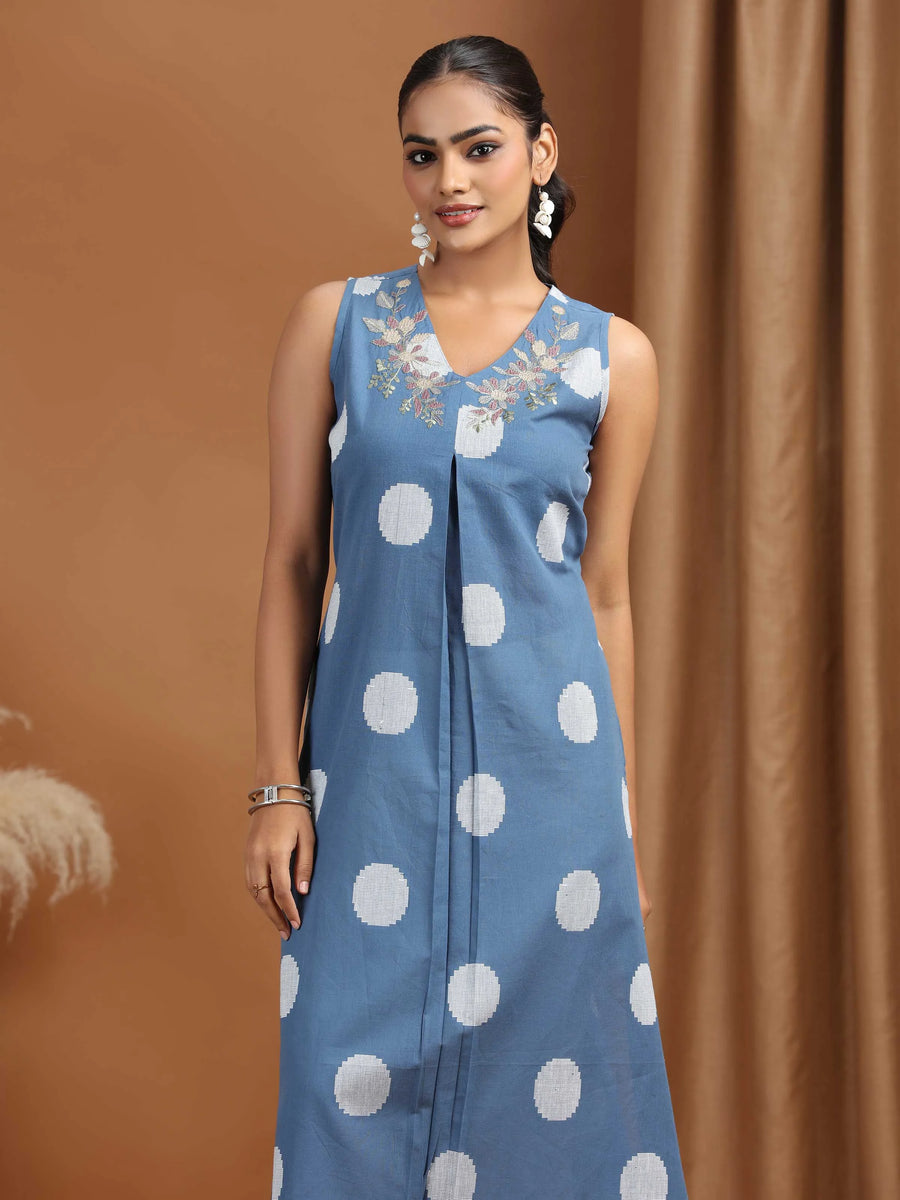 Indigo Embroidered Cotton Flared Dress
