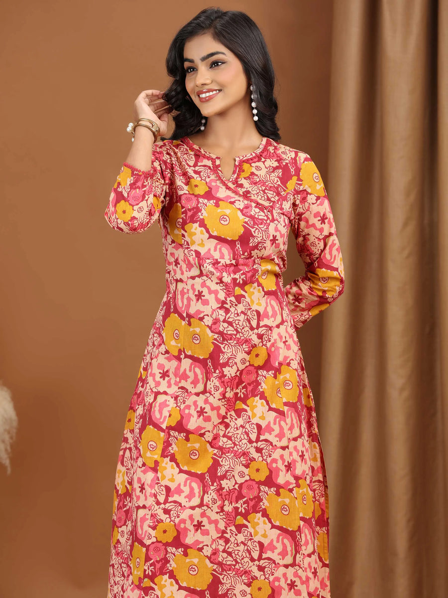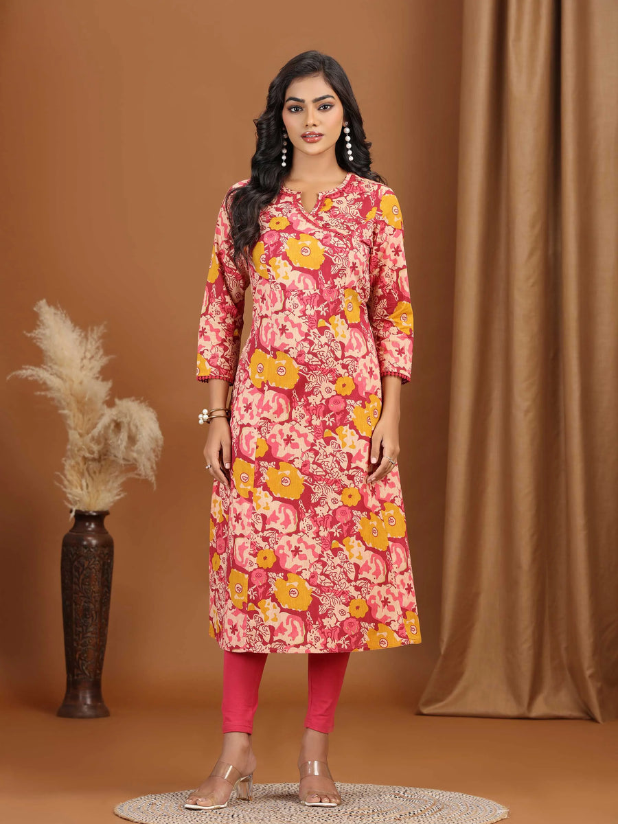 Soft light peach hues with delicate floral prints. This cotton A-line kurta offers a breezy, flattering fit perfect for effortless everyday elegance. Pair with minimal accessories, flats & a fresh natural look for a graceful vibe.