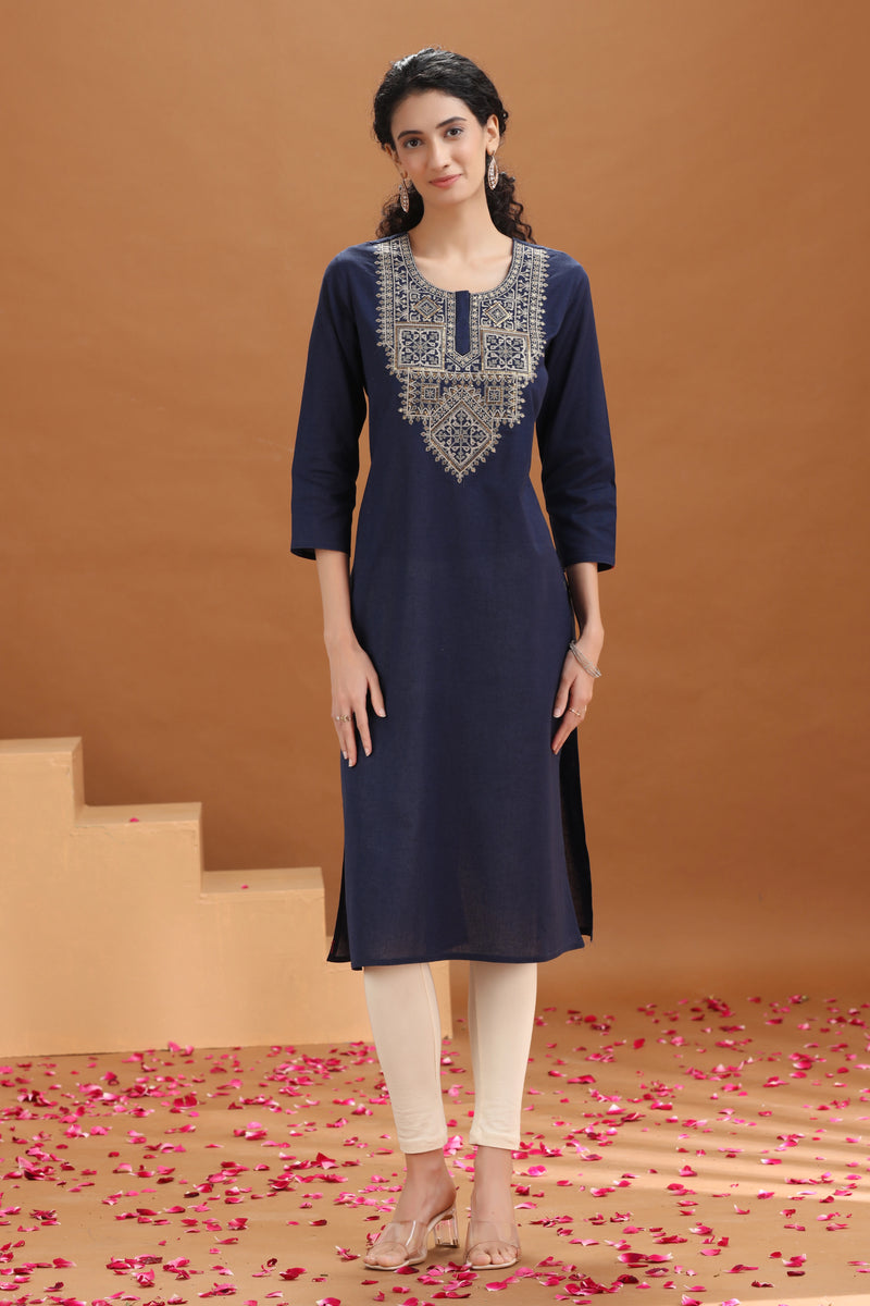 Classic navy blue straight kurta in breathable cotton with subtle embroidery and a round neck silhouette.