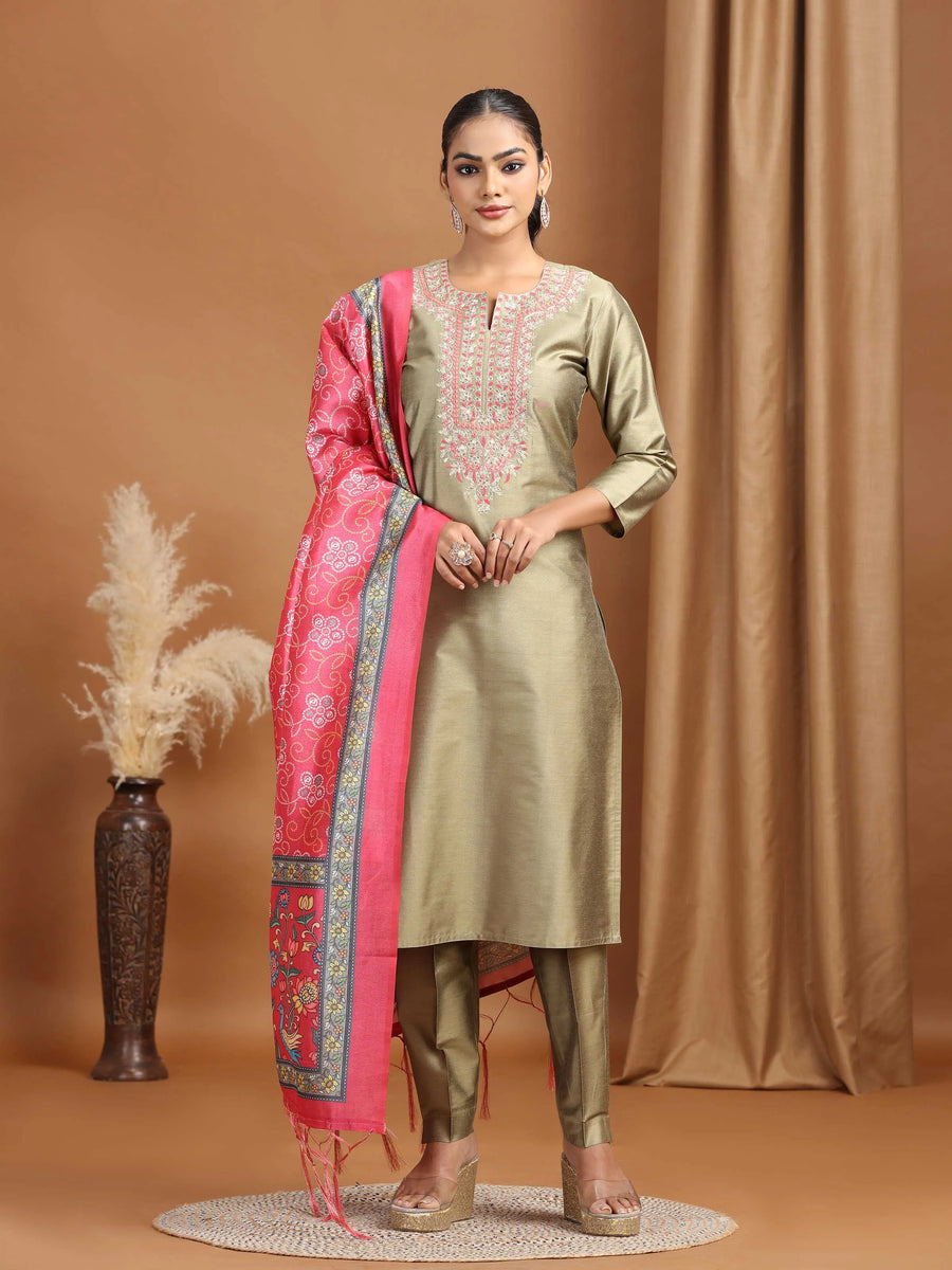 Soft pastel green with delicate floral embroidery. This straight ethnic set offers a fresh, graceful look perfect for daytime occasions and easy elegance. Pair with minimal jewelry, flats, and a natural glow for effortless charm.