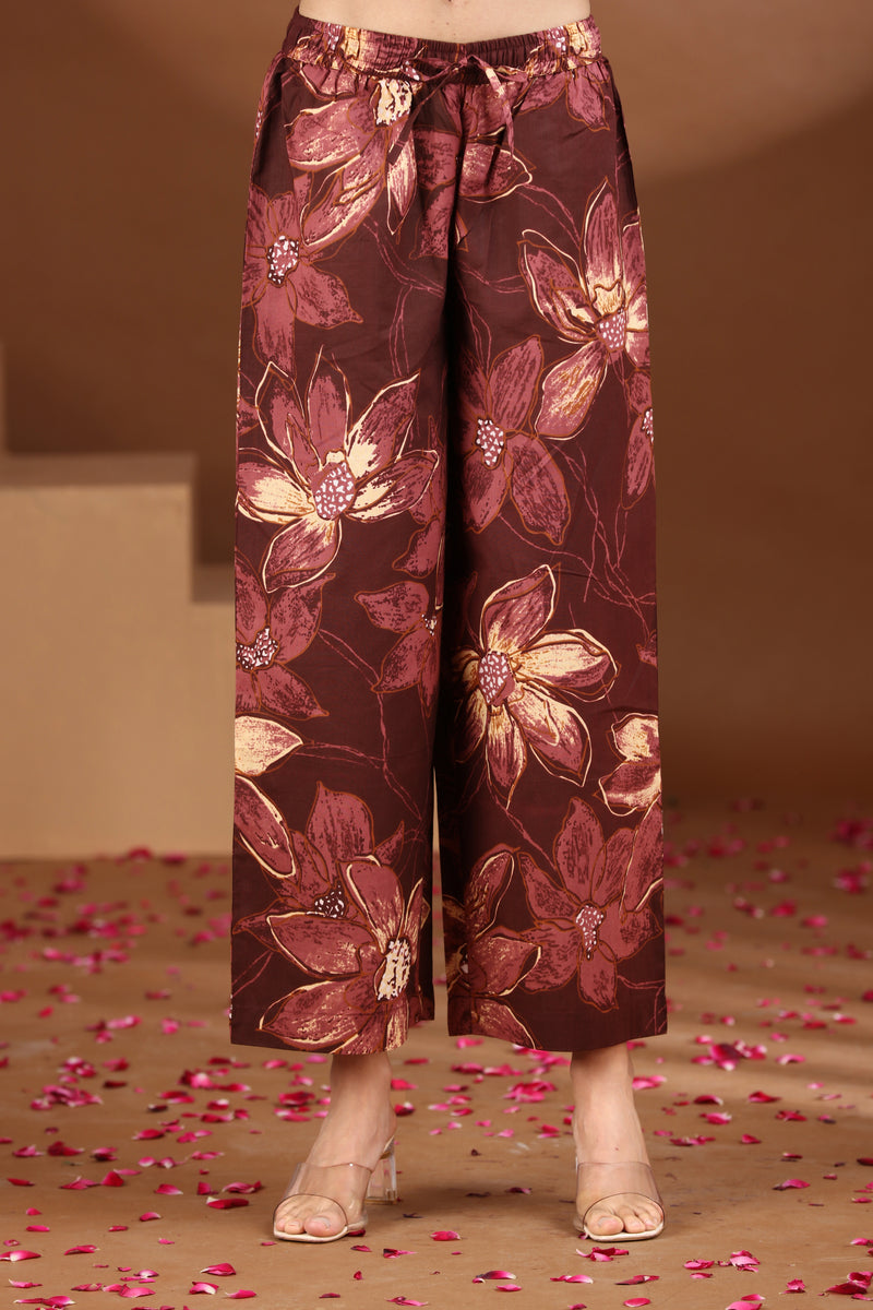 This wine floral printed cotton A-line co-ord set from Cotton Culture features a classic round neck comfortable 3/4 sleeves and perfectly coordinated pants. Crafted in breathable cotton with a graceful floral print it offers all-day comfort and effortless elegance making it ideal for everyday wear office wear and casual outings.