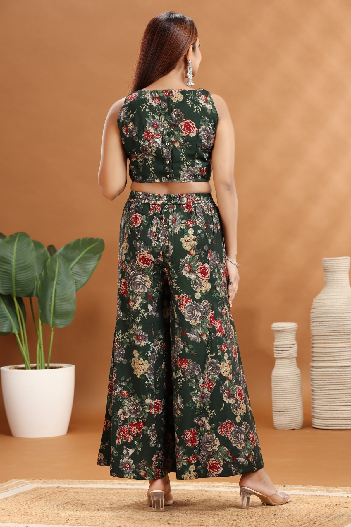 Green & Maroon Roman Silk Chanderi A Line Printed Kurta Pant Co ord Set