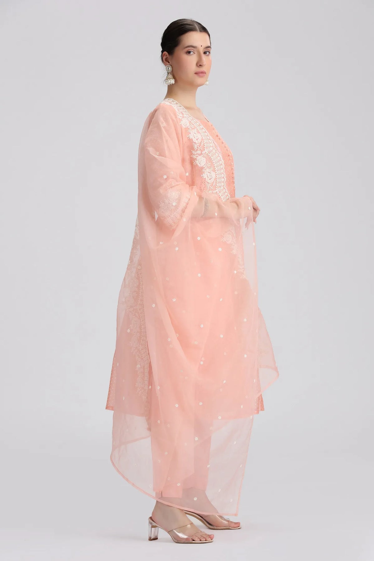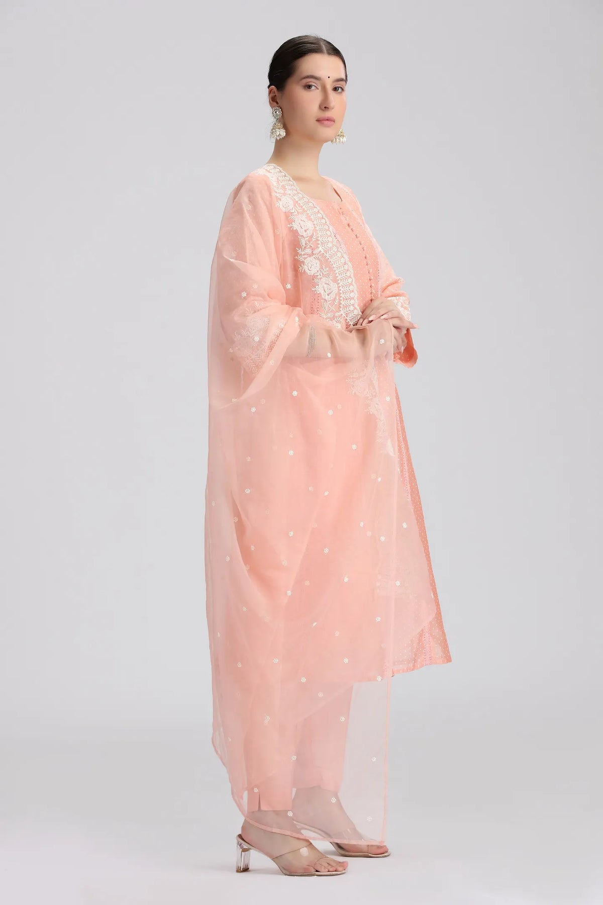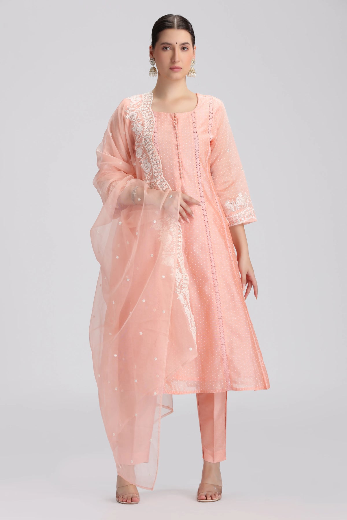 Light Salmon Chanderi Embroidered A Line Kurta Pant and Dupatta Suit Set
