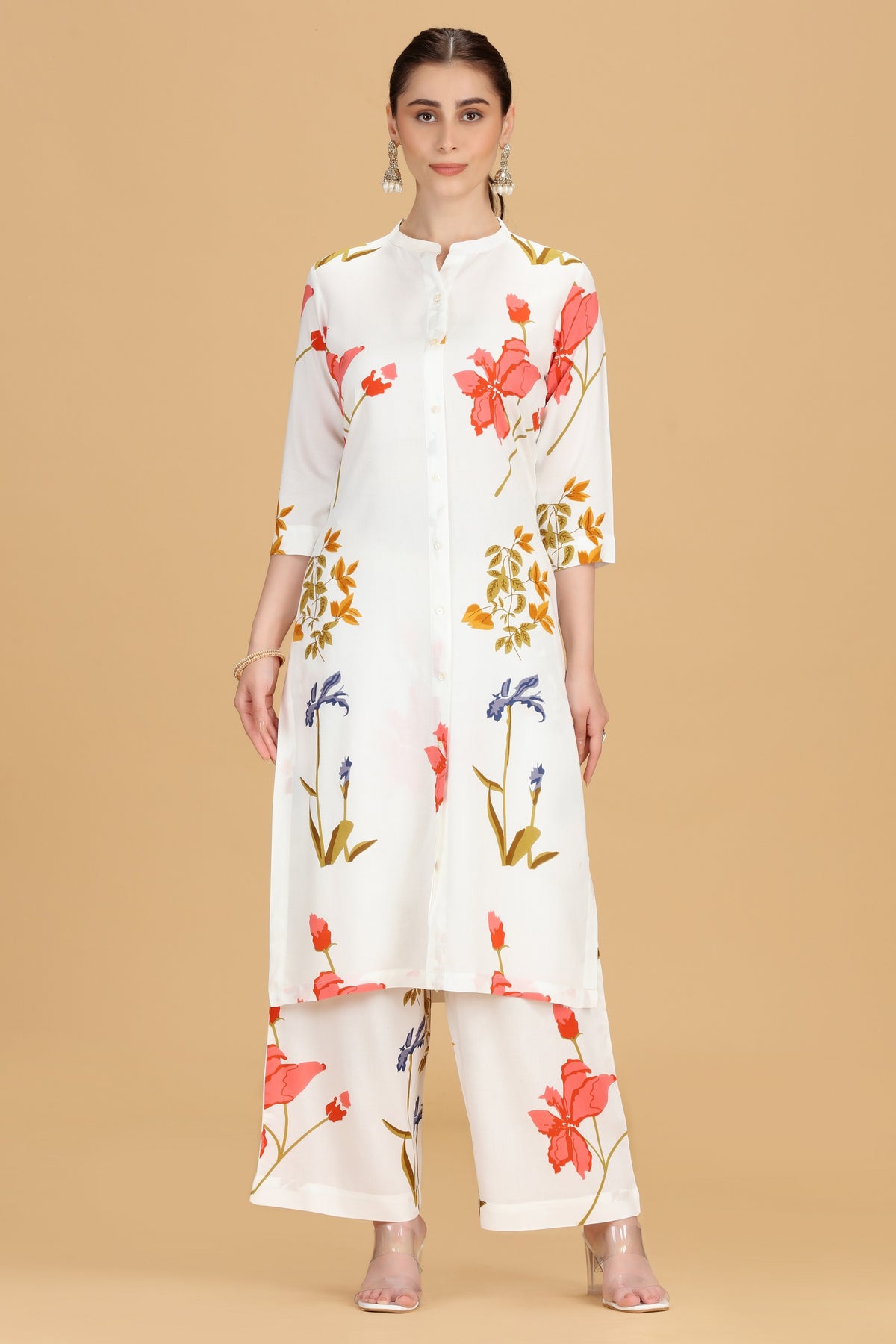 White Rayon A Line Printed Kurta Pant Co ord Set