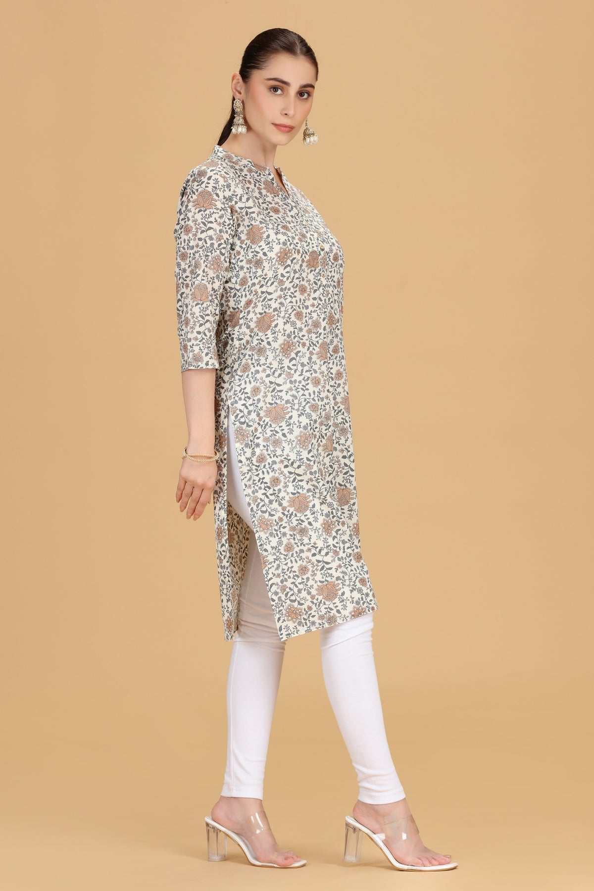 Crafted from breathable cotton this off-white kurta features a refined printed design that blends tradition with subtle modernity. Its straight cut offers a tailored fit ensuring comfort and elegance for daily wear or casual occasions. Ideal for those seeking effortless style with a touch of heritage craftsmanship.