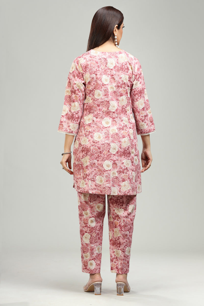 Peach Flax Cotton Straight Printed Kurta Pant Co ord Set
