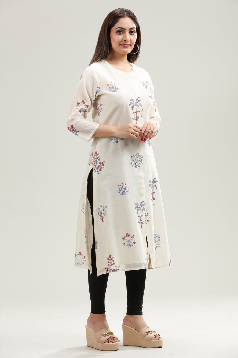 This stunning Off White Chanderi A Line Printed Kurta is the perfect addition to your wardrobe. The lightweight fabric is both comfortable and stylish, while the A-line silhouette flatters any body type. With a beautiful printed design, this kurta is sure to make a statement and turn heads. Elevate your style and exude confidence with this gorgeous kurta!