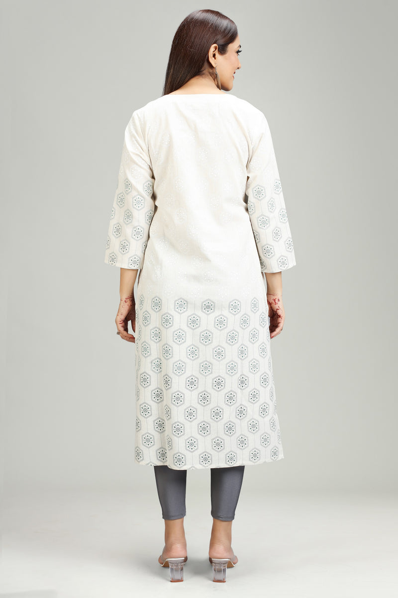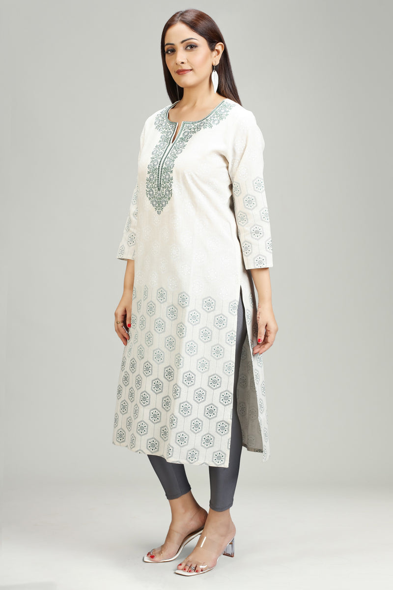 Off White & Green Flax Cotton Straight Embroidered Kurta