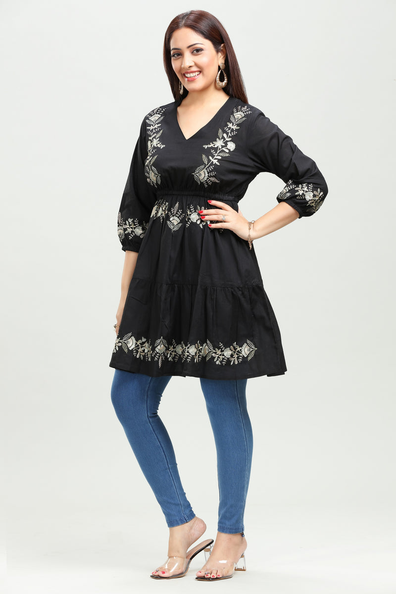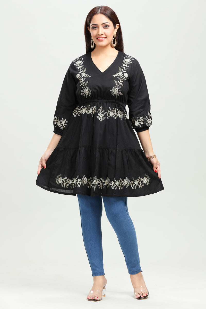 Black Cotton Flared Embroidered Short Kurta